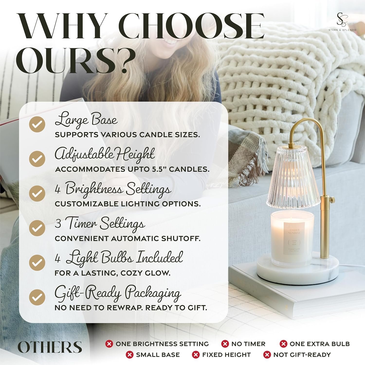 Easily Adapts to Every Candle’s Dimensions: The candle warming lamp has a generous 6.5-inch base and an adjustable height of 11.5 to 14 inches; So, our candle wax warmer lamp has the flexibility to fit jar candles of various shapes and sizes