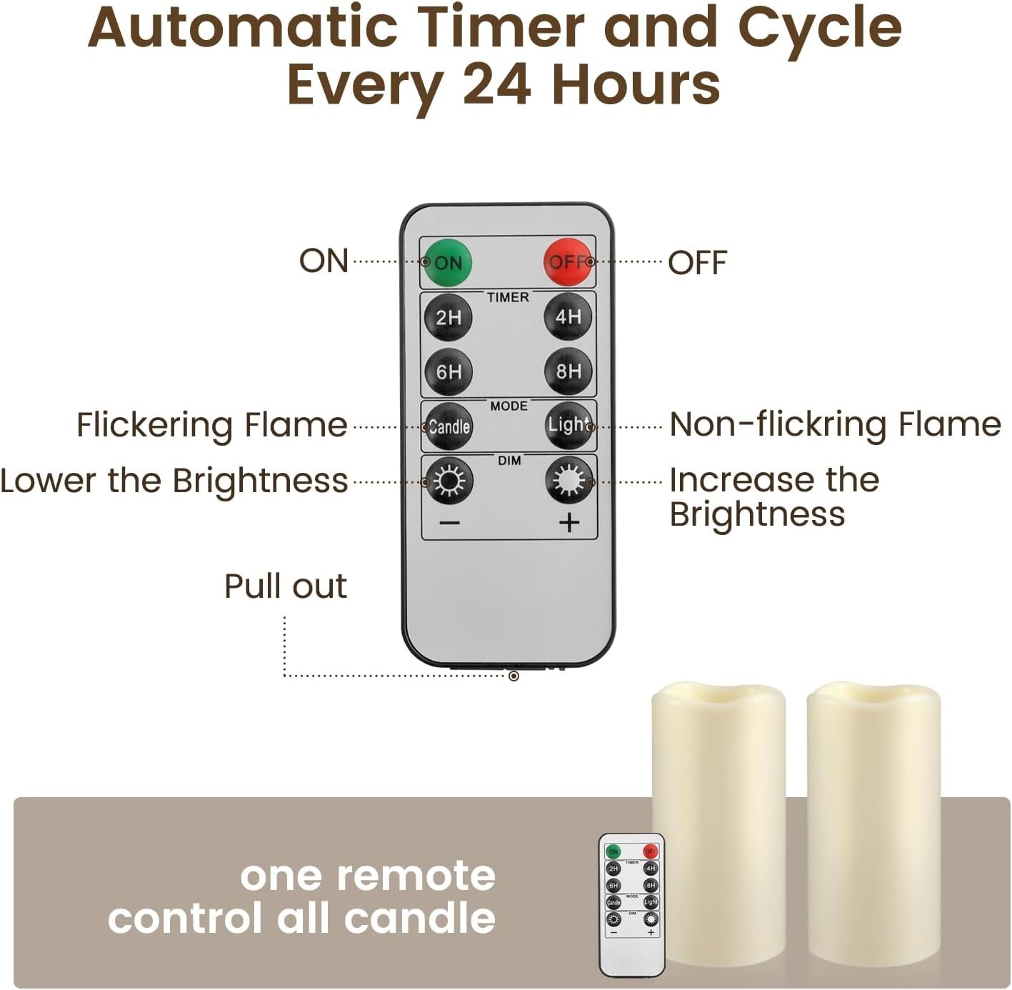 3.The timer function -10 button remote control allows you to display candles in difficult to reach areas. You can choose between 2/4/6/8 hour timer and static flashing light options and brightness levels. The timer cycles every 24 hours