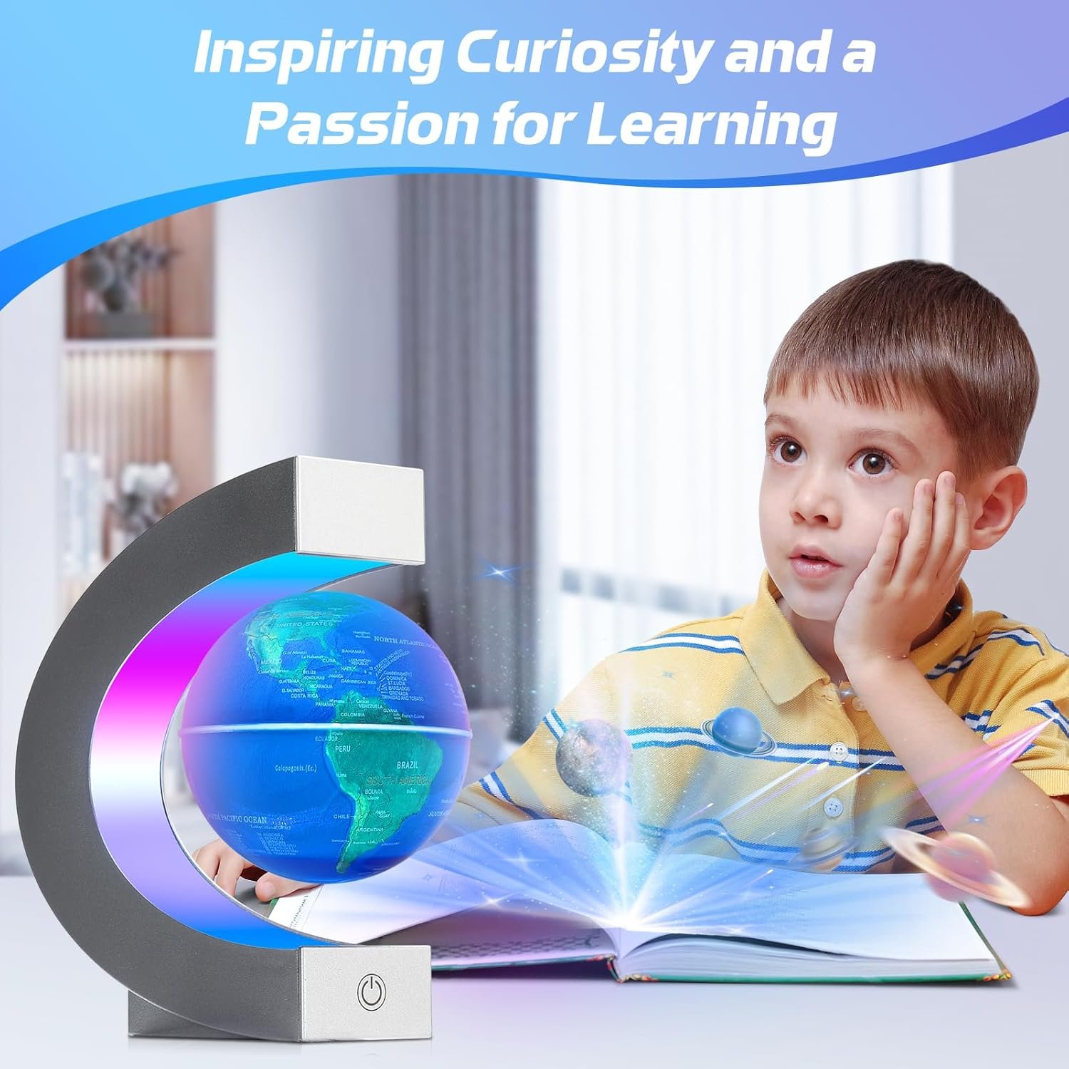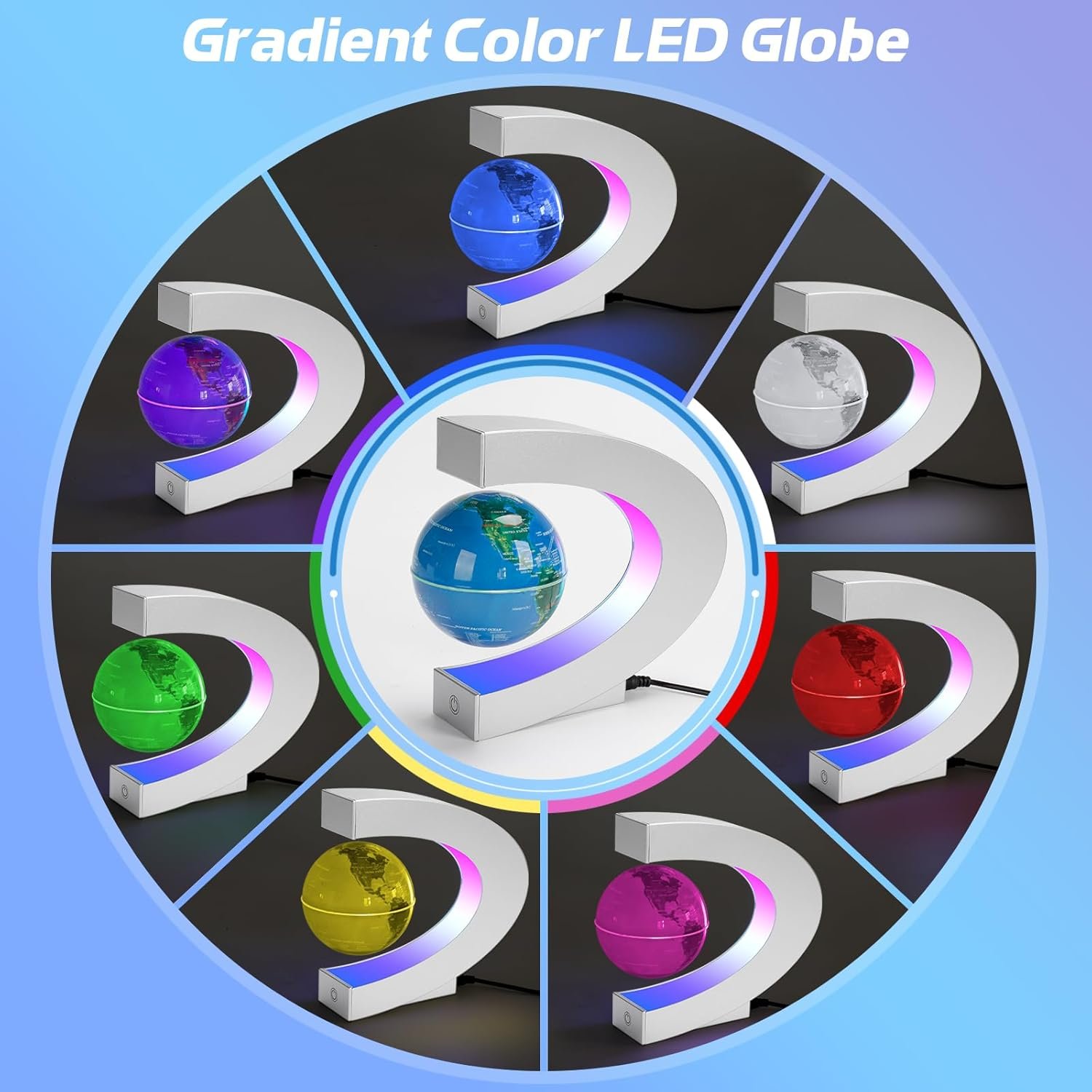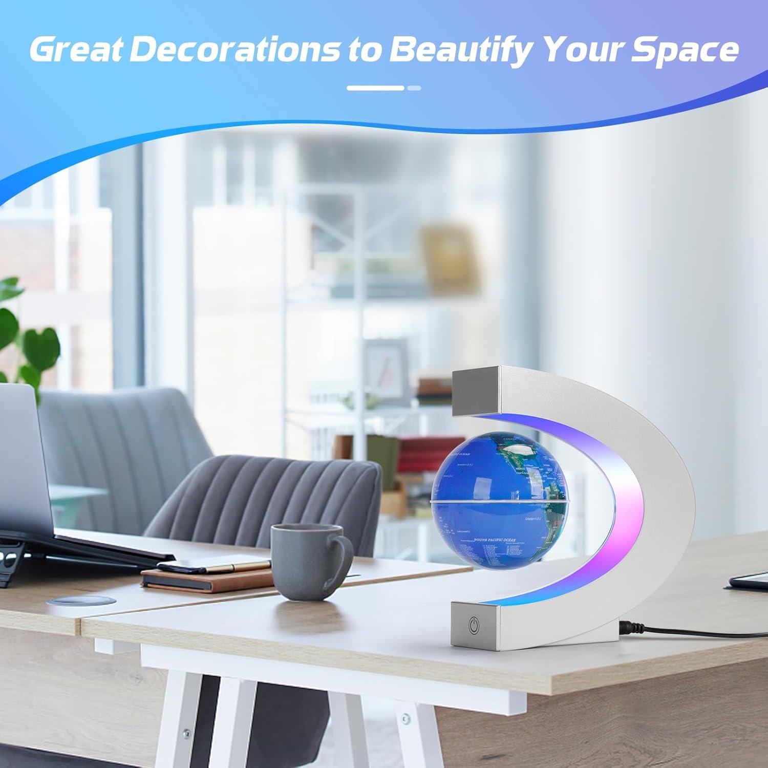 🌎COLOR CHANGING LED LIGHTS: Our floating globe features multi-colored LED lights and the sphere automatically cycles through different colors. The changing lights of the globe are very cool when working in the dark. It adds a dynamic and captivating atmosphere to tabletop and space decor, making it an ideal conversation piece at parties.