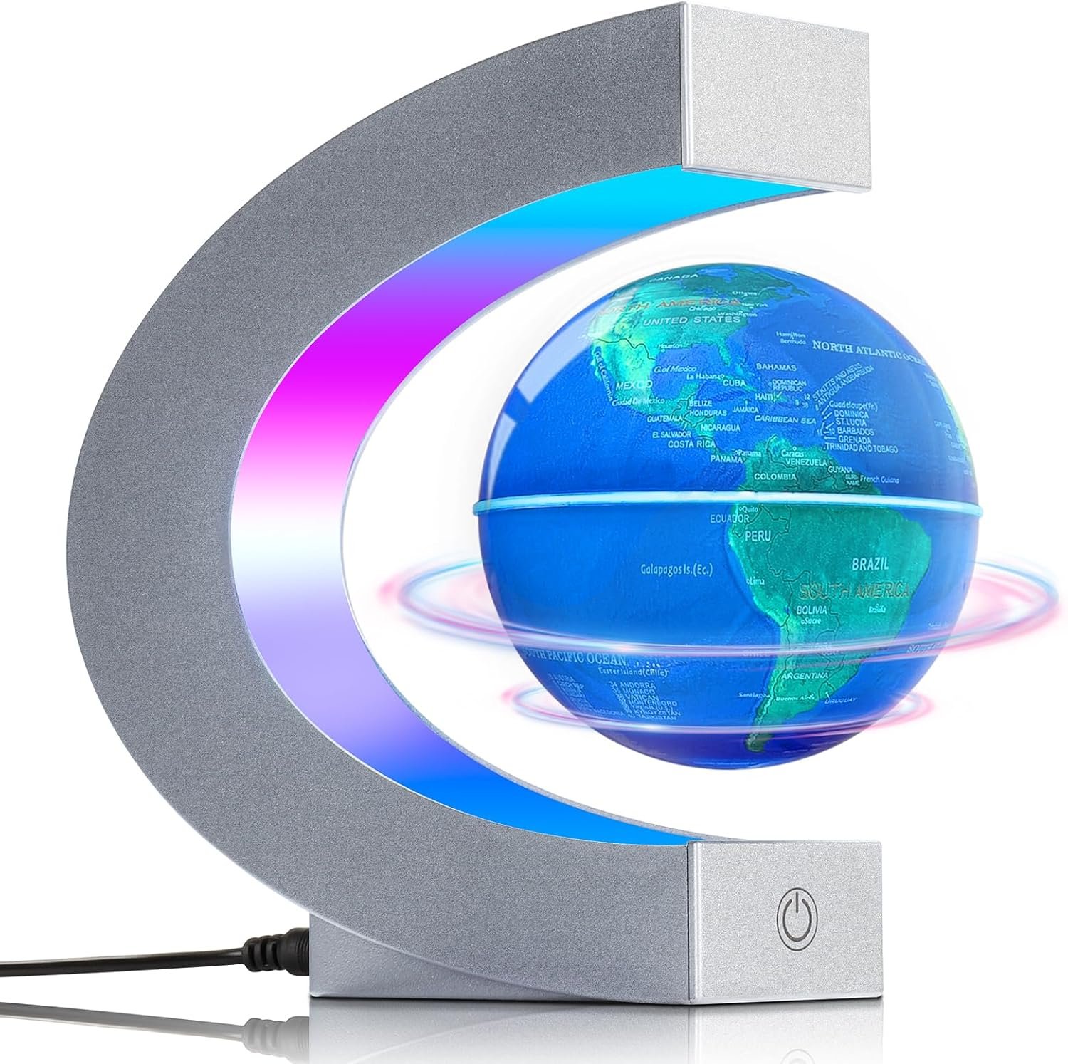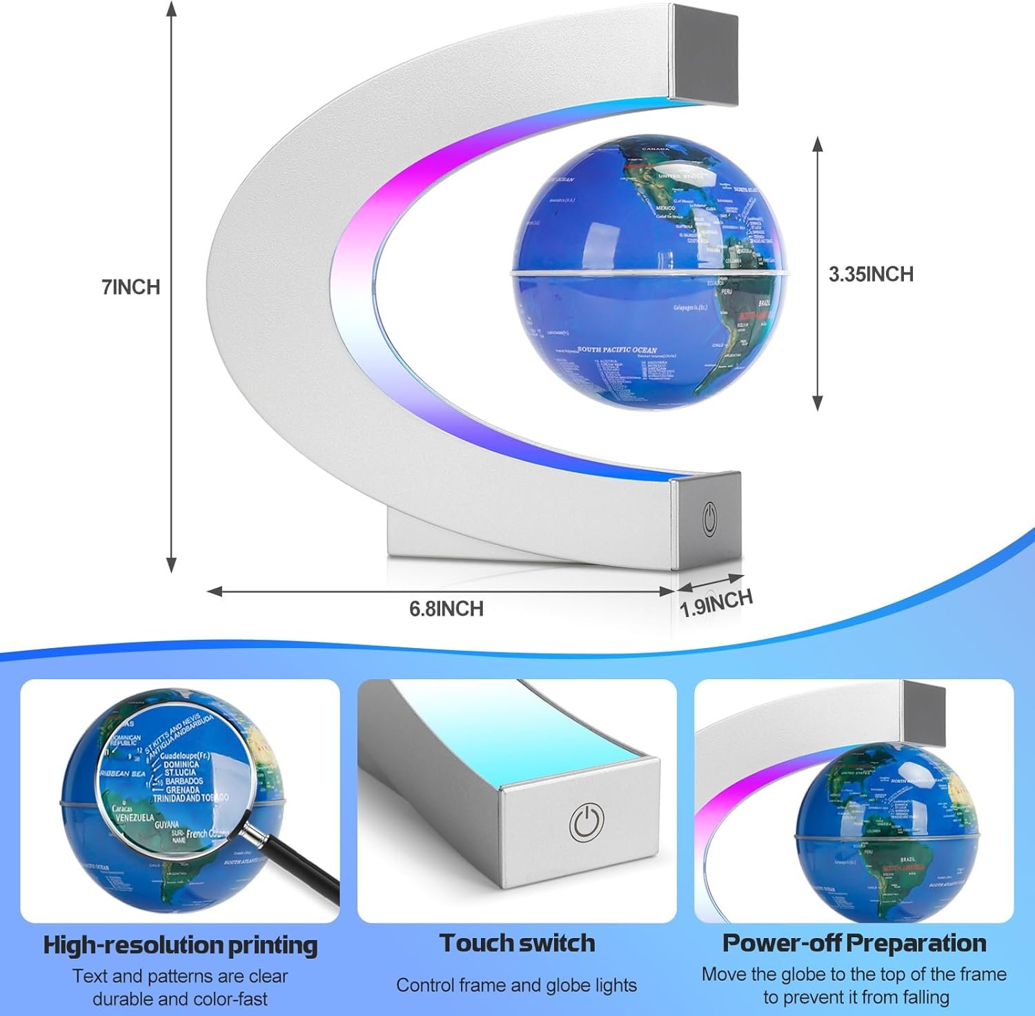 🌎TOUCH SWITCH: This magnetic levitation globe comes with a touch switch that controls the lights of the frame and the sphere separately. Not only can it be used as a night light, it is also a perfect display unit for all spaces such as desks, bookshelves, classrooms, home or office conference rooms.
