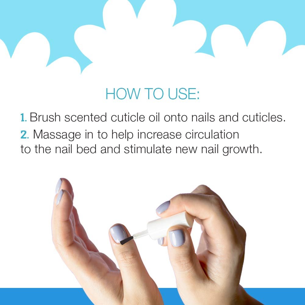 Brush scented cuticle oil onto nails and cuticles.Massage in to help increase circulation to the nail bed and stimulate new nail growth.