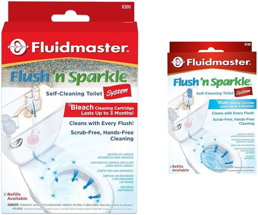 The Fluidmaster automatic toilet bowl cleaning bundle includes two easy-to-install systems that provide hands-free cleaning with every flush. The first system comes with a bleach cartridge that lasts up to 3 months, while the second contains an upgraded formula with a blue cartridge. Both systems fit most toilets and take just minutes to install. They place cleaning solution directly into the overflow tube rather than using tablets or liquids that can damage flappers and tank components. The formula cleans and deodorizes with every flush without scrubbing or harsh chemicals, keeping the bowl crystal clear for months. The original 8300 system relies on the cleaning power of bleach to break down stains and residue. Its cartridge contains a concentrated bleach formula to deodorize and sanitize. The upgraded 8100 system has an improved blue formula designed to clean faster and last longer between changes. The systems come with all necessary mounting hardware, cartridges, tubing and adapters for hassle-free maintenance. Additional replacement cartridges are sold separately once the systems’ up to 3 month cleaning capacity is depleted. With both systems, you can say goodbye to manual bowl scrubbing and enjoy a cleaner, fresher toilet. The 8300 and 8100 bundle offers short and long term cleaning options suitable for every household.