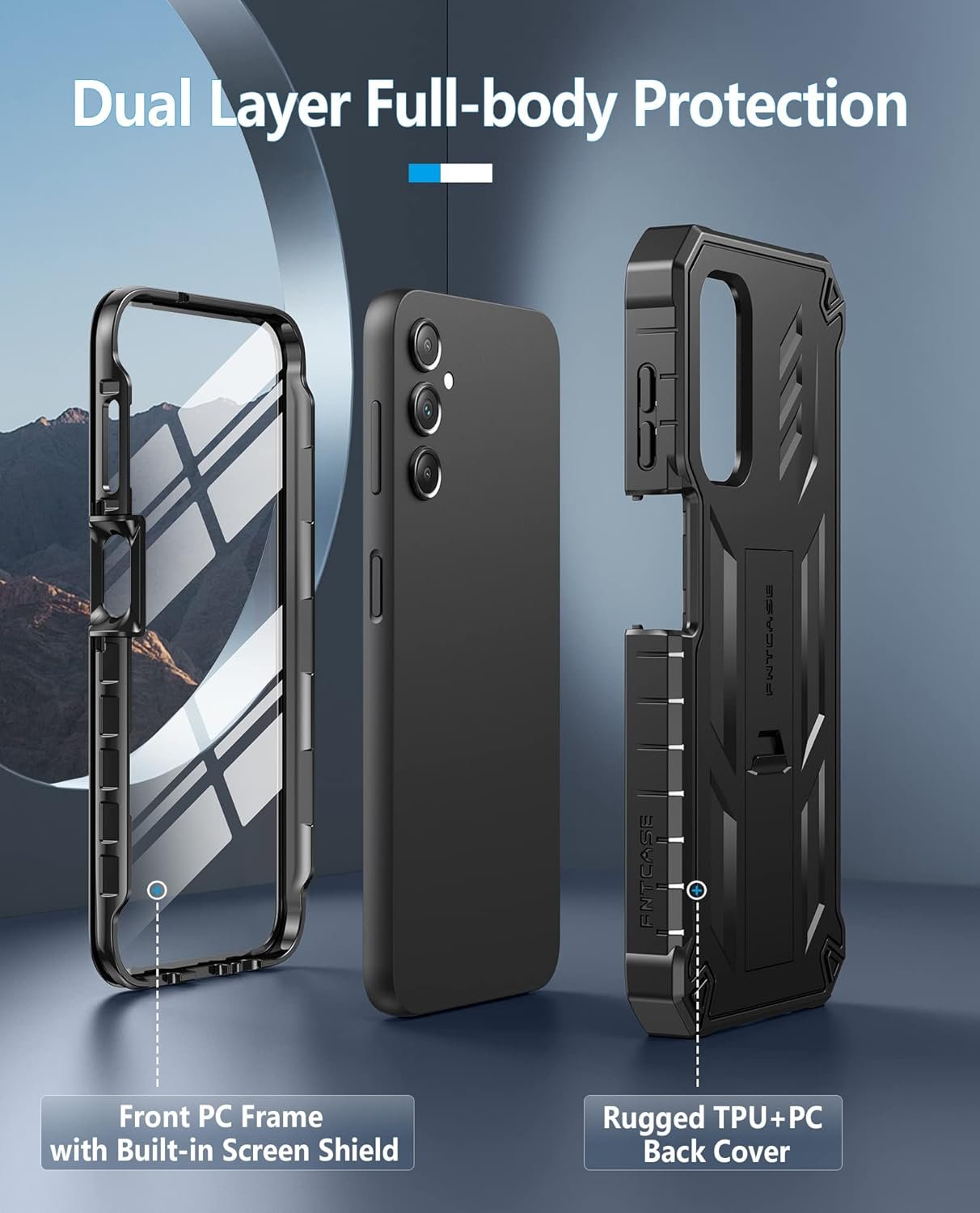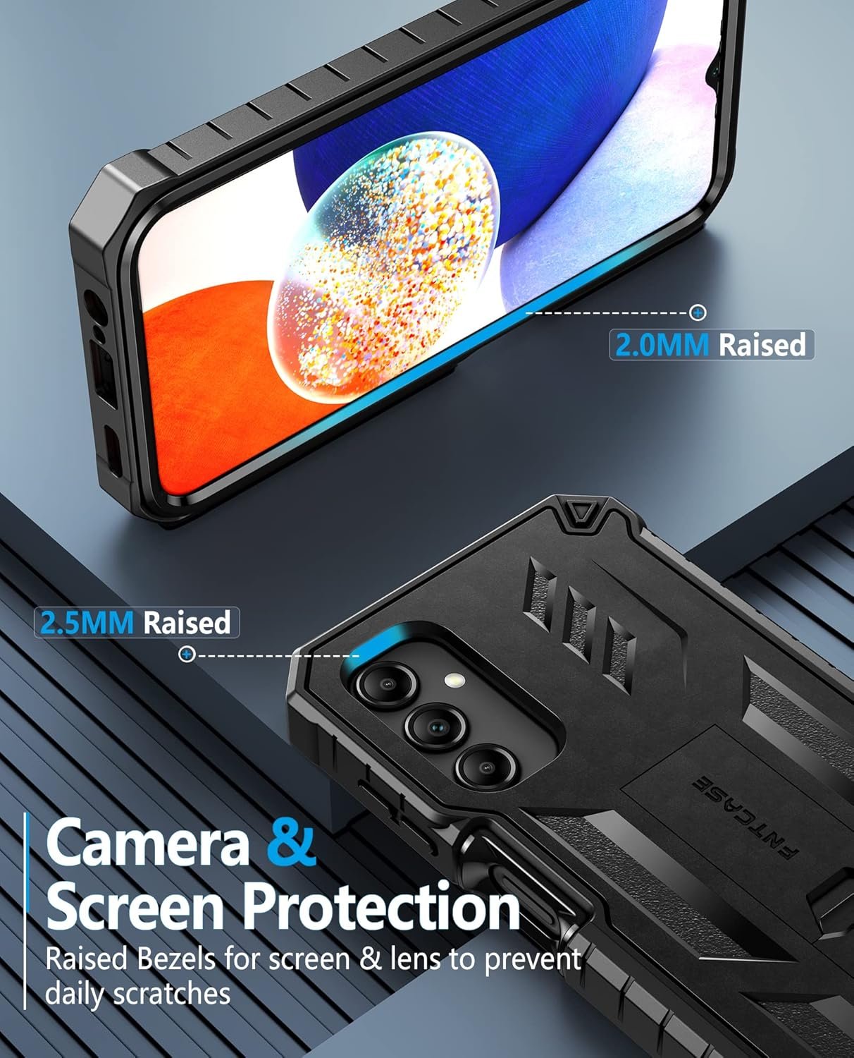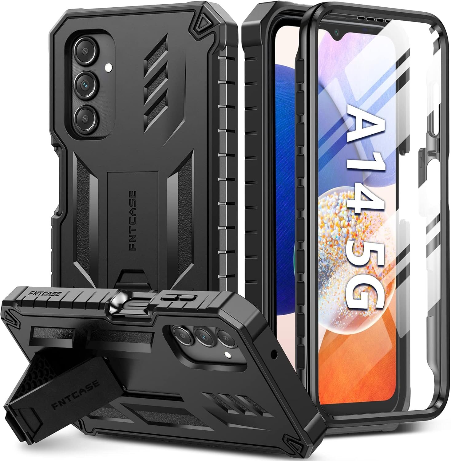 FNTCASE for Samsung Galaxy A14-5G Case: Dual-Layer Protective Textured Shockproof Rugged TPU Cover with Kickstand | Military Grade Drop Protection | Heavy Duty Cell Phone Protector – Black