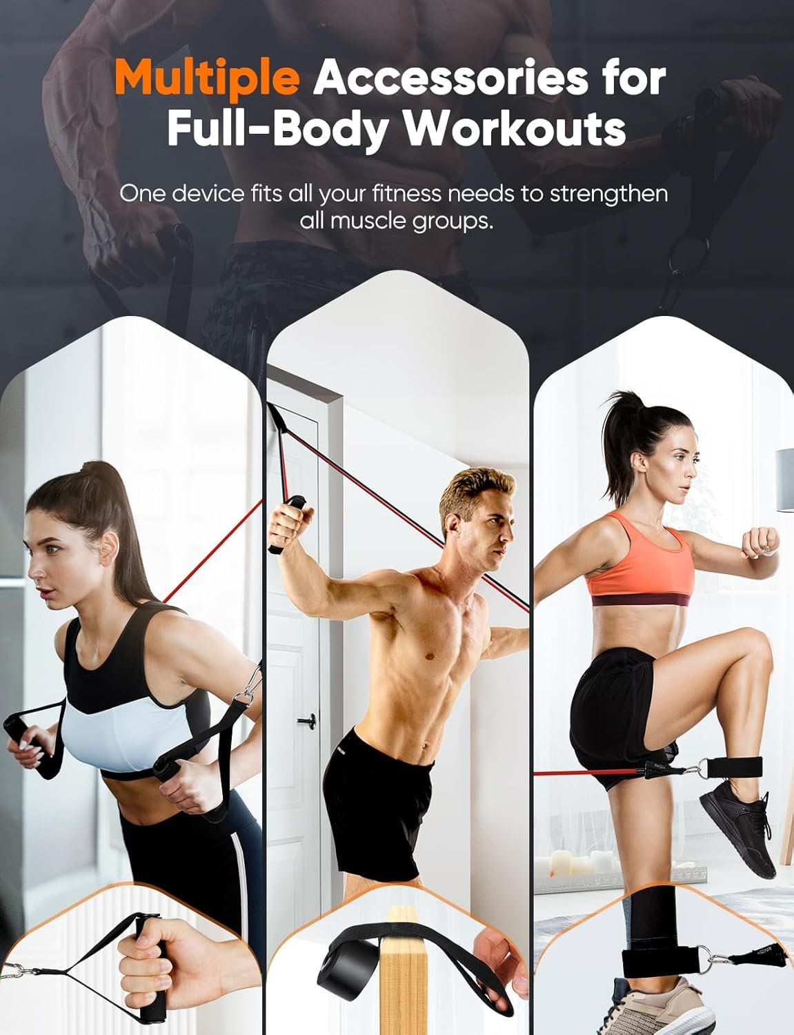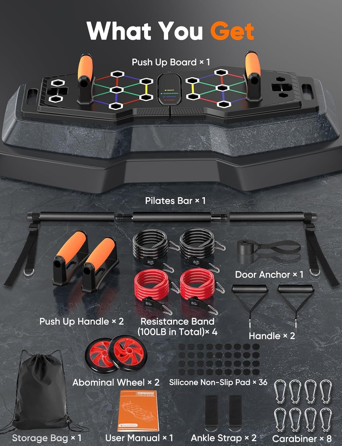 Professional Workout Equipment for Home Gym. Besides the primary function as a push up board for professional push up training, the exercise equipment gets more versatile when there is a pilates bar, wrist/ankle straps, AB rollers, resistance band(*4), and door anchor included. A set of fitness equipment achieves a lot of exercise ways, allowing you to customize your workout plans and adjust the exercise intensity according to your situation