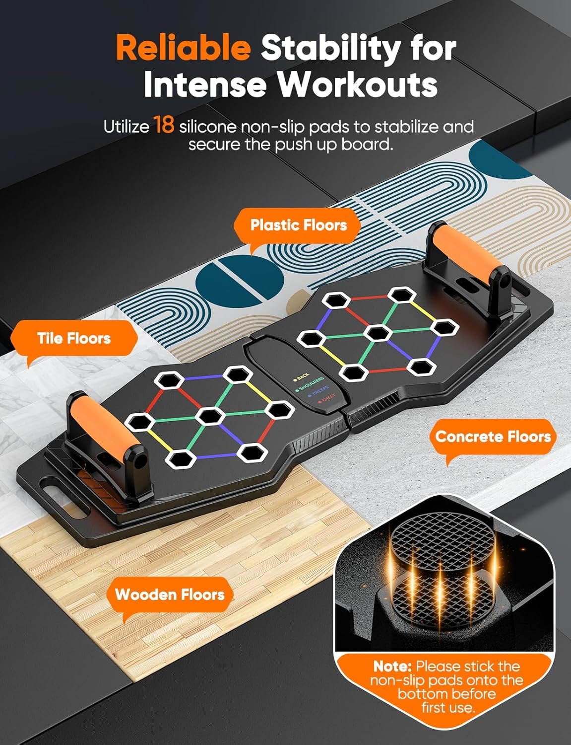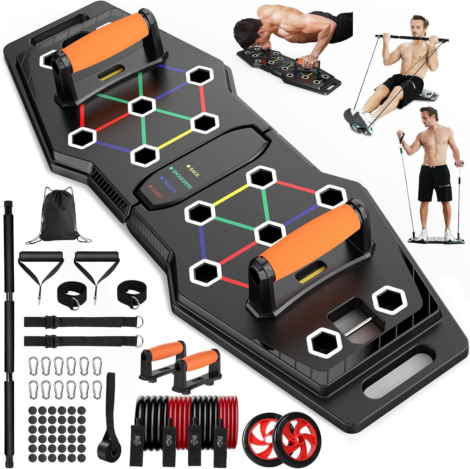 Color-Coded System, 13 Positions Considered the most effective multifunctional push-up equipment, the foldable push up board comes with lines in four colors: yellow for the back, red for the chest, green for the shoulders, and blue for the triceps. Connect the same colored line and always keep the two handles symmetrically placed. It’s more than a push-up board for push-ups only when multiple accessories like a pilates bar, wrist/ankle straps, AB rollers, resistance bands, and a door anchor are available. From a beginner to a master, you will always find it helpful during upper and lower-body workouts. Upgraded Material, Trusted Quality Bearing a max weight of 300kg, the push up board is crafted with thickened ABS material, which is more durable and impact-resistant to provide reliable and stable support. Compared to EVA anti-slip mats that others apply, these wearproof silicone ones produce stronger friction between the floor to ensure safety during intense workouts. Focus on your exercises only after sticking the anti-slip mats onto the bottom of the board. Four resistance bands are made of durable and flexible natural latex, which is highly elastic and won’t break directly and instantly, even if it splits