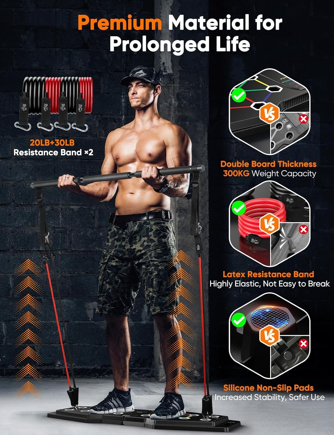 Reliable Premium Material for Safe and Long-Term Use. The pushup board is crafted with quality ABS material with high durability and rigidity and outstanding resistance to impact, abrasion, and strain; meanwhile, the board thickness is doubled to enhance the load-bearing capacity to 300kg/661lbs. Silicone non-slip pads increase the stability of the board. Latex resistance bands are more durable and flexible for long-term use without breakage issues