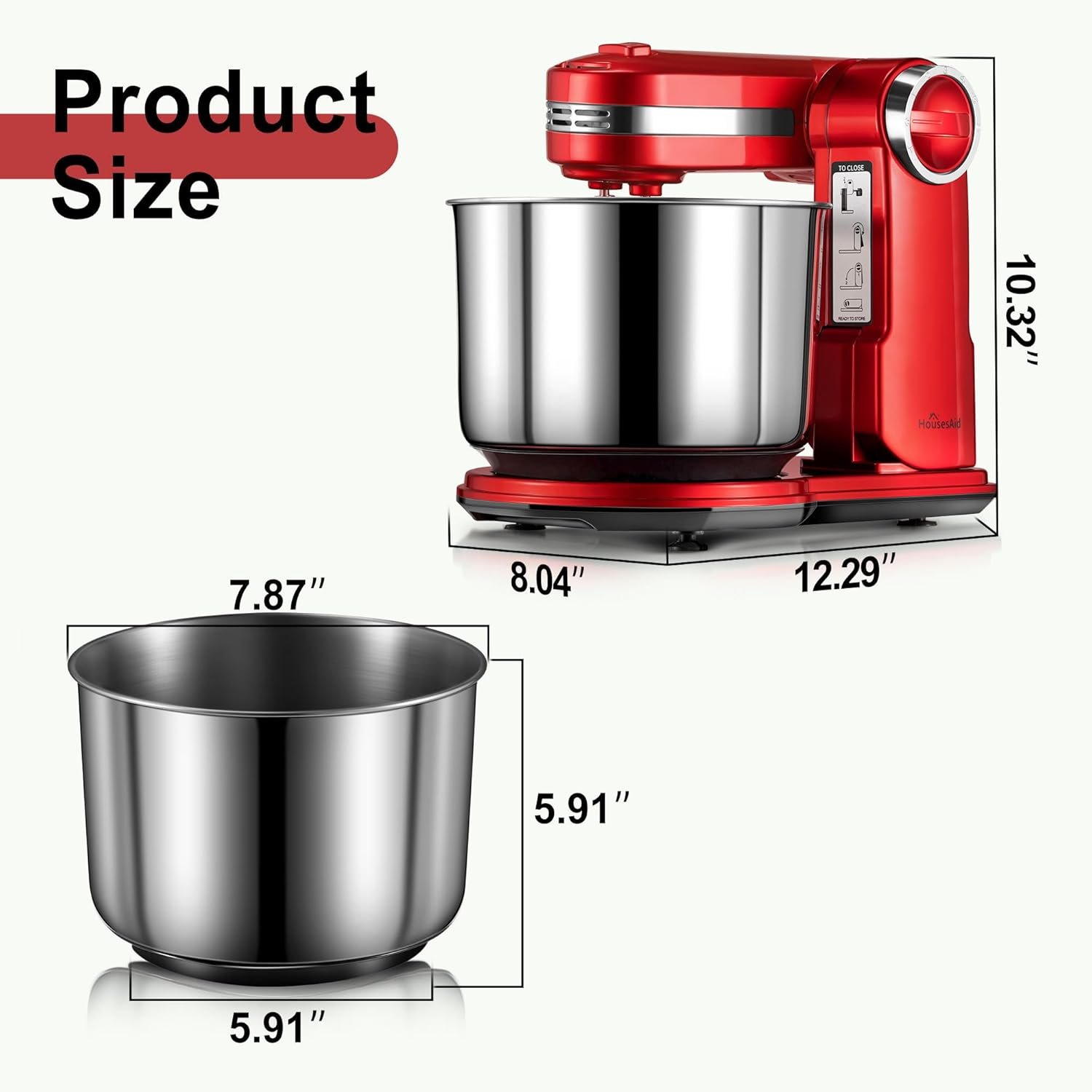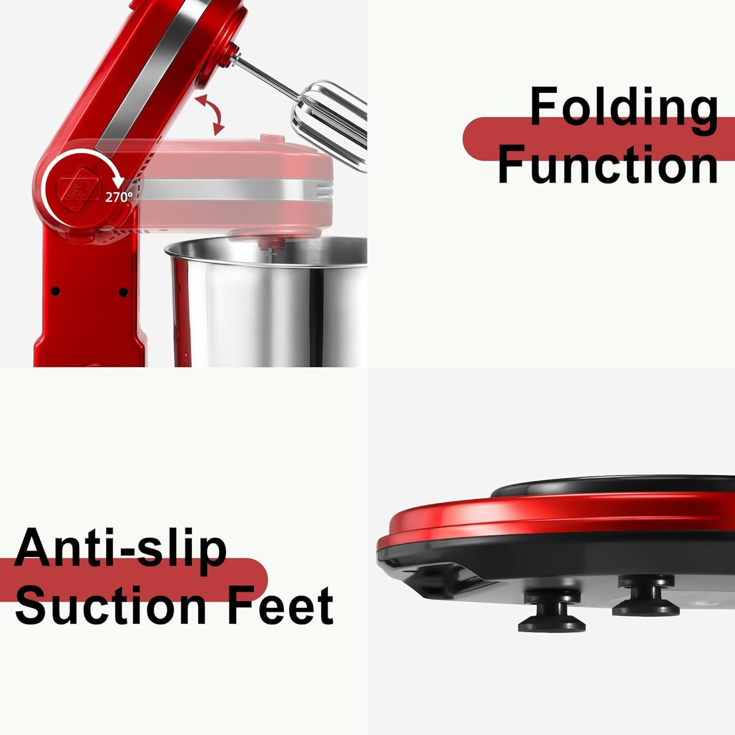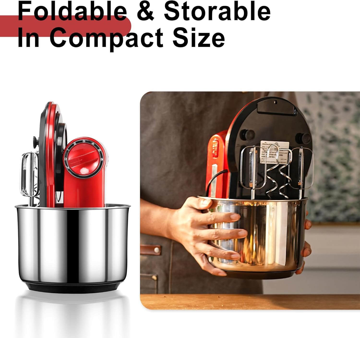 Compact and Unique Folding Design Our stand mixer features a patented folding design, exclusive to the market, making it perfect for small kitchens. When not in use, this compact mixer can be easily folded and completely stored within its 3.7QT stainless steel bowl, reducing the overall size to just 12.3×8 inches, saving valuable countertop space.