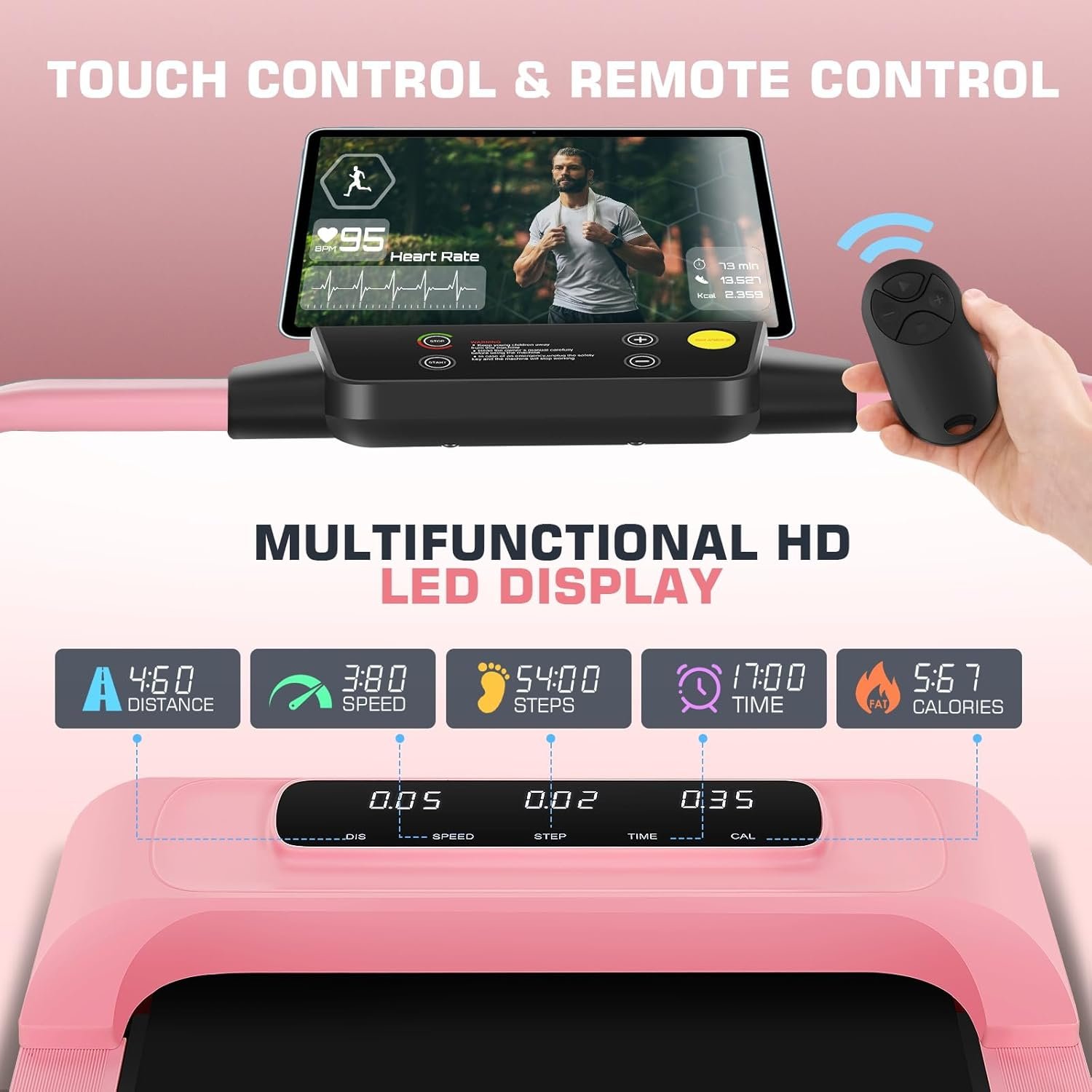 【HD LED Display & 2 Control Modes】➤➤This larger LED display clearly shows your speed, distance, time, calories, and steps, helping you track and record the data and adjust your workout plan in real time. You can adjust the speed using either the remote control or the touch keyboard.