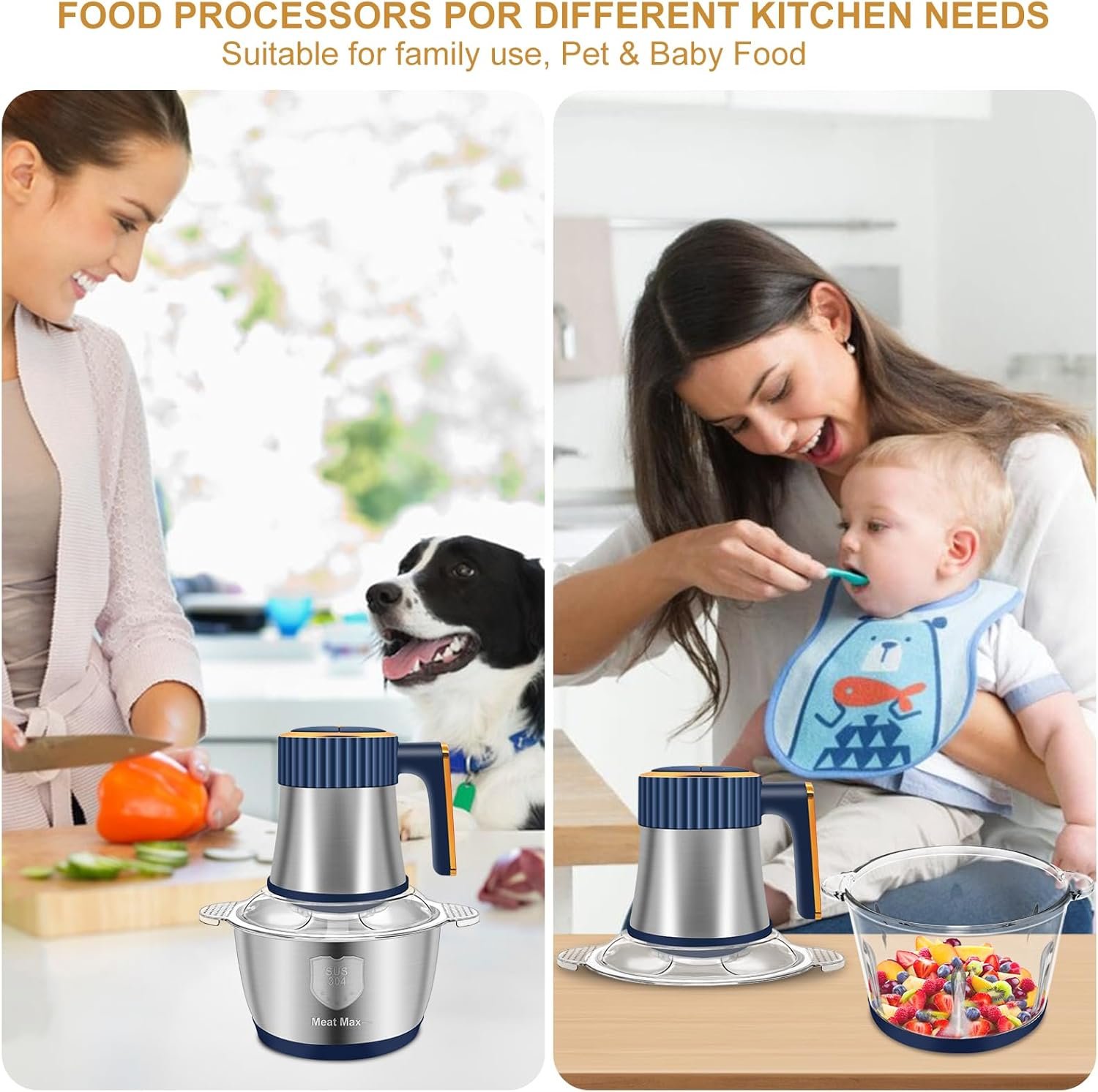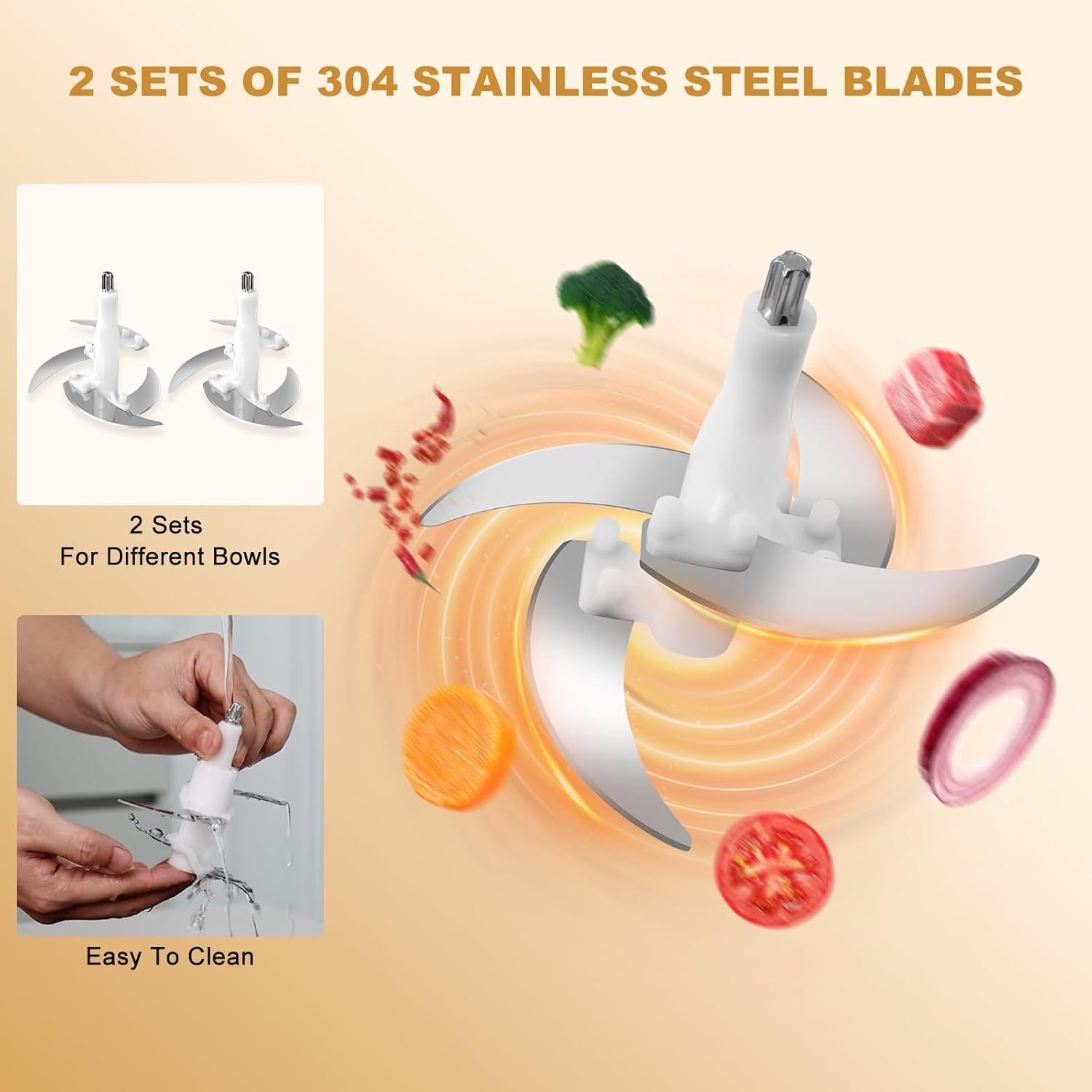 WHAT YOU GET: The package includes 1 motor(300W), 1 glass bowls(8 Cup), 1 stainless steel bowls(8 Cup), 2 sets of blades, 1 scraper, 1 mixer, and 2 anti slip rubber pads