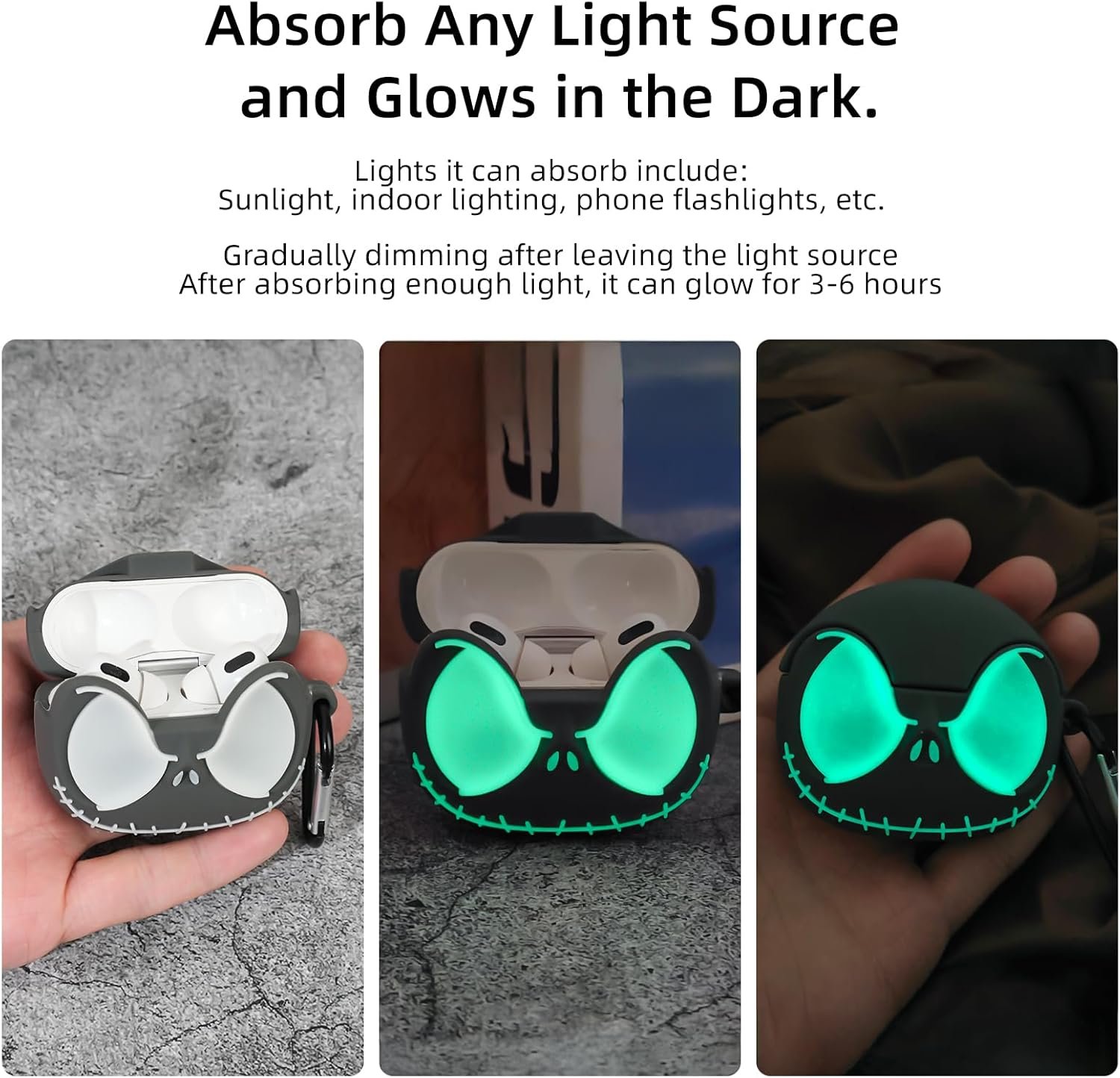 [Eyes Glow in the Dark] (Absorb Any Light Source And Shine In The Dark), With its 3D skull-shaped design, this funny Airpods pro/pro 2 case is guaranteed to turn heads at nigh. After absorbing enough light, the eyes of this Airpods pro 2/1 case can glow for 3-6 hours and gradually darken after leaving the light source.