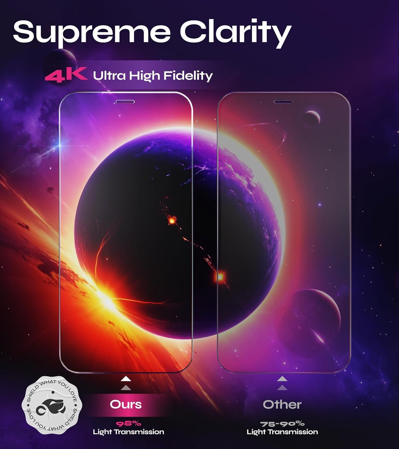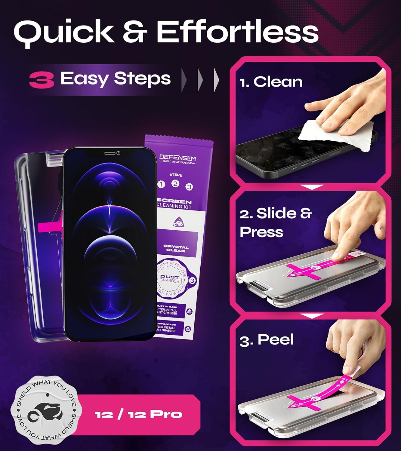 ✔️ 9H Nearly DIAMOND-LIKE HARDNESS Screen Protector iPhone 12, 12 Pro to completely avoid shattering, cracking and scratches. The High-Quality OLEOPHOBIC COATING keeps your screen fingerprint-free, air bubble-free and dust-free