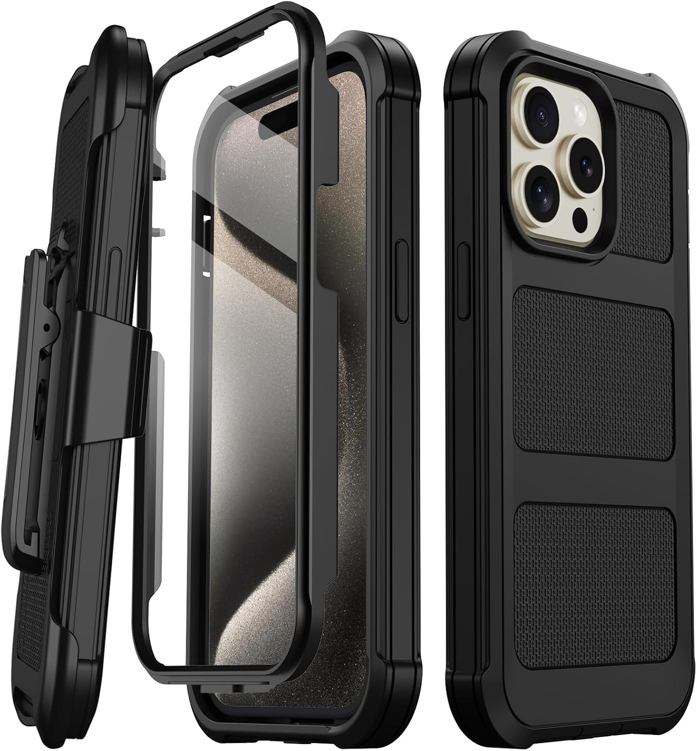 for iPhone 15 Pro Max Case, [Built-in Screen Protector] Heavy Duty Military Grade Drop Protection Shockproof Phone Case for iPhone 15 Pro Max with Kickstand & Belt Clip Holster 6.7” (Black)