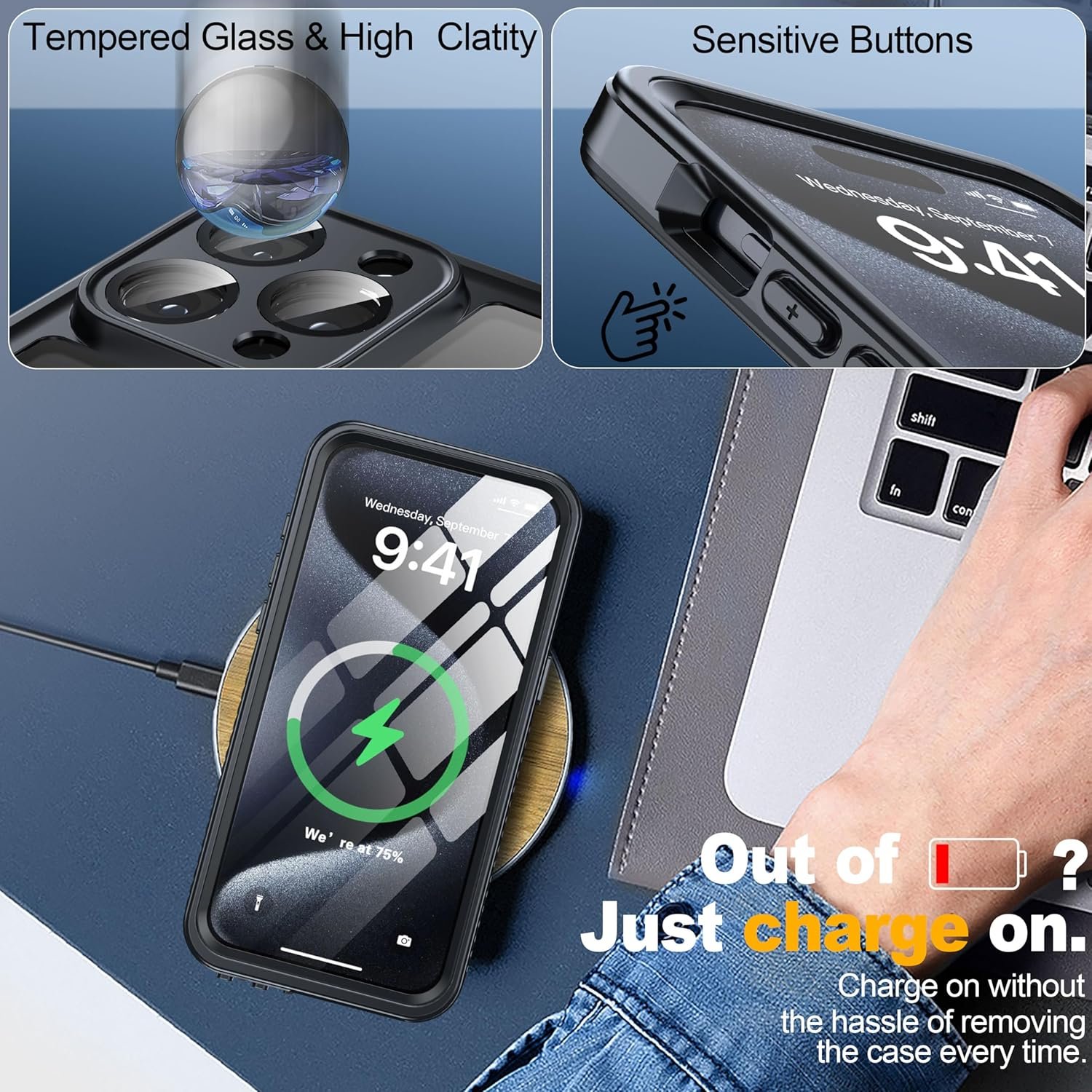 ✨【Effectively Supports Wireless Charging】This iPhone 15 Pro Max case supports wireless charging. (Note: When installing, please pinch the frame of the phone case to achieve a seamless seal. The back panel of the phone and the back panel of the phone case fit tightly. In order to better use wireless charging, when charging wirelessly, please align the charger center phone on the back)