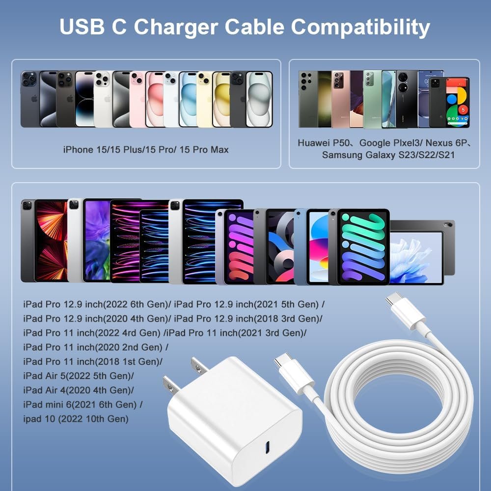 【Universal Compatibility】 20W USB C Fast Charger Compatible with most USB-C devices, including for iPhone 16/16 Pro/16 Pro Max/16 Plus/15 Series/iPad Air/iPad Pro and More