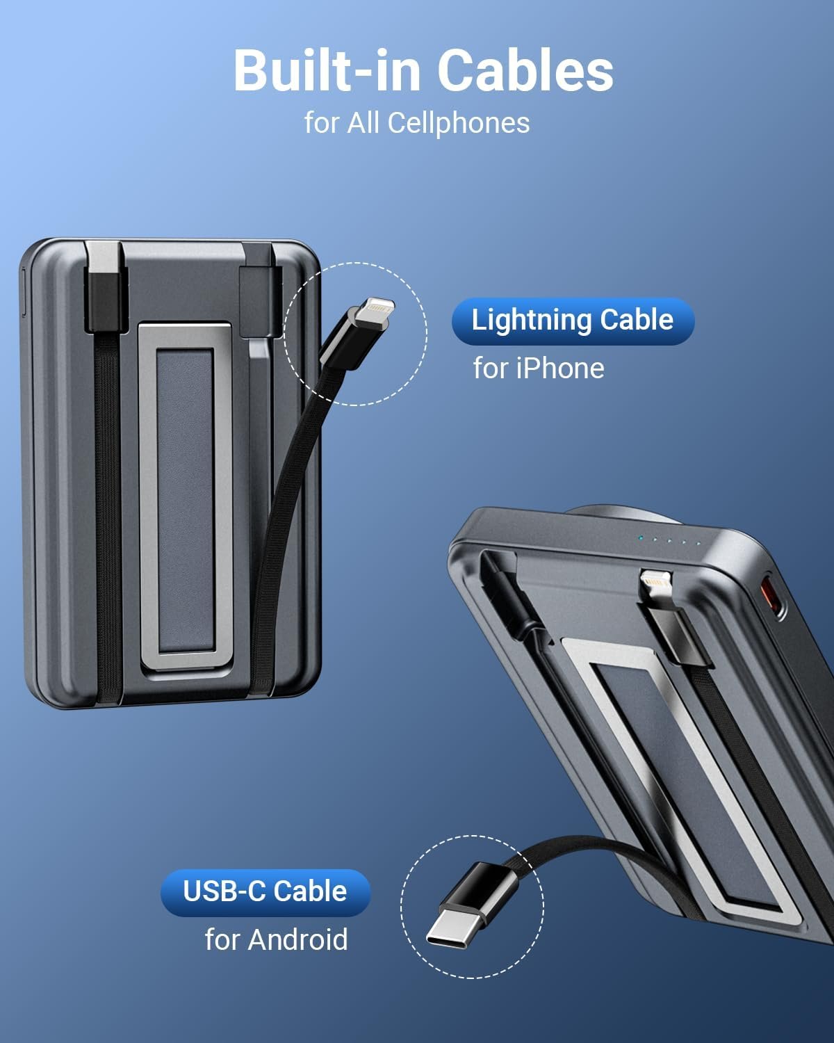 【Built in Cables and Stand】Equipped with USB Type C and Lightning cable, it allows you to charge your phone if it does not support wireless charging. The wireless portable charger for iphone with foldable kickstand, holds your phone for easy viewing. The slim and lightweight design does not block the camera lens. Perfect size for traveling, fit right into your pocket, purse, or backpack even if it’s just a daily external battery pack.