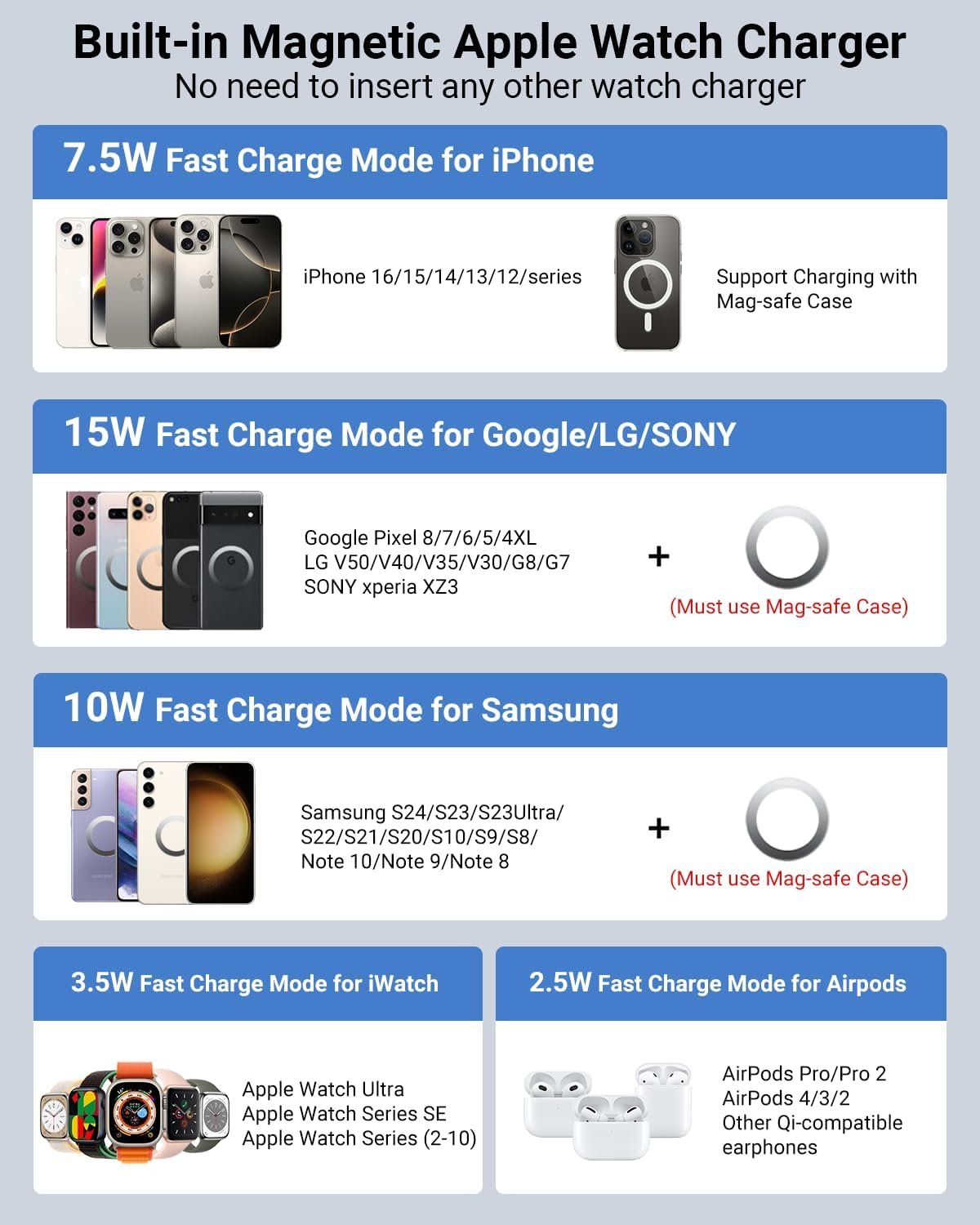 【5 in 1 Apple Magsafe Portable Charger】For wireless charging, the wireless powerbank can charge your iPhone, Apple Watch, and AirPods. For cable charging, it can charge 2 phones at the same time with two built in cables. Perfect MagSafe Battery Pack for iPhone 16/16 Plus/16 Pro/16 Pro Max/15/15 Plus/15 Pro/15 Pro Max/14/13/12, Samsung Galaxy S24 Ultra/S23+/S23/S22 and other qi Phones. Great iWatch charger for Apple Watch Ultra 2/Ultra/10/9/8/7/6/5/4/3/2/SE, Airpods Pro/4/3/2.