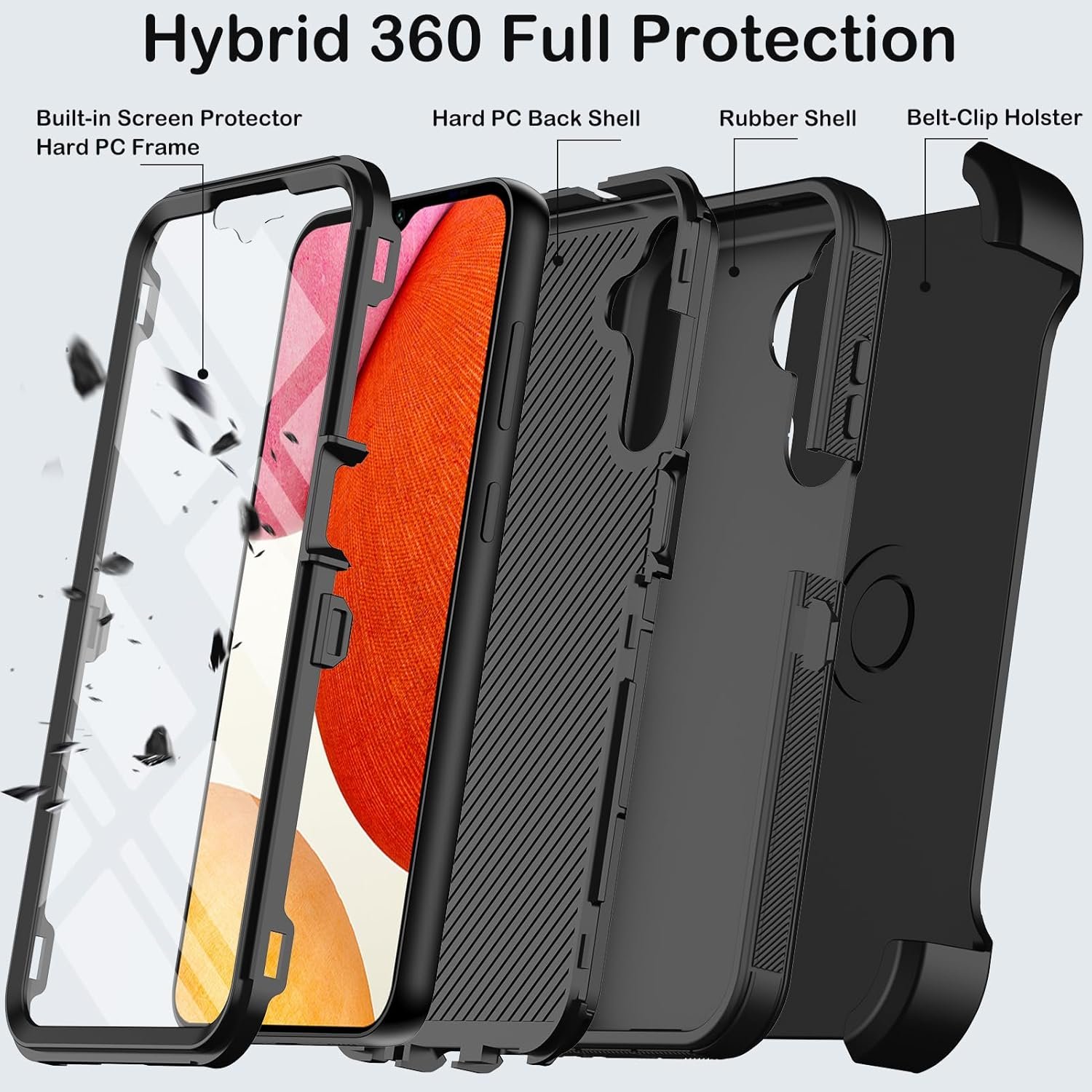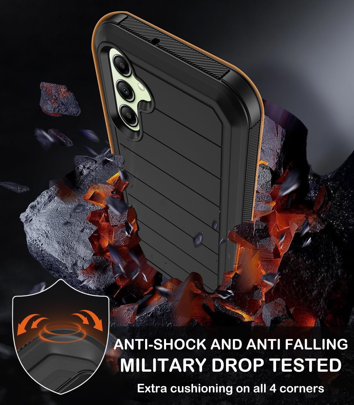 [MULTI-LAYER DEFENSE PROTECTION] Our Samsung Galaxy A14 military-grade heavy-duty case.It provides exceptional defense against drops,dirt,scrapes,and bumps.The hybrid construction of PC,TPU inner shell,and soft silicone outer shell disperses impacts and prevents scratches.Our case has passed military drop tests of up to 10 feet,guaranteeing your device’s integrity in rough conditions.With its triple-layer design,it offers 360° full-body rugged protection,safeguarding every corner of your Samsung Galaxy A14 5G.