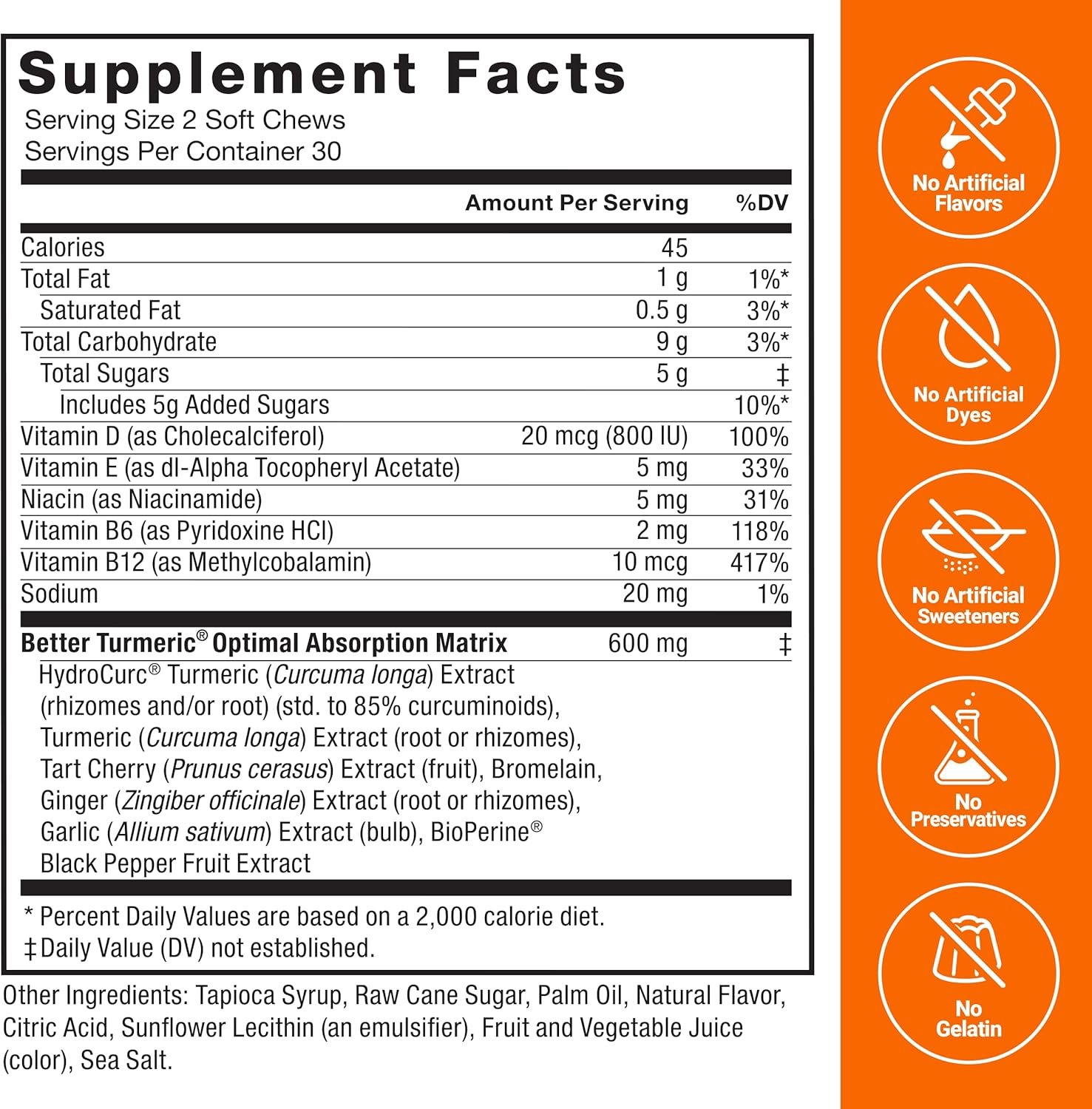 BOOST ENERGY & STRENGTHEN IMMUNITY: Providing even more than the average joint support supplement, Better Turmeric soft chews also include vitamin D to promote immune health, and a potent dose of B vitamins to help boost energy for greater day-to-day support.