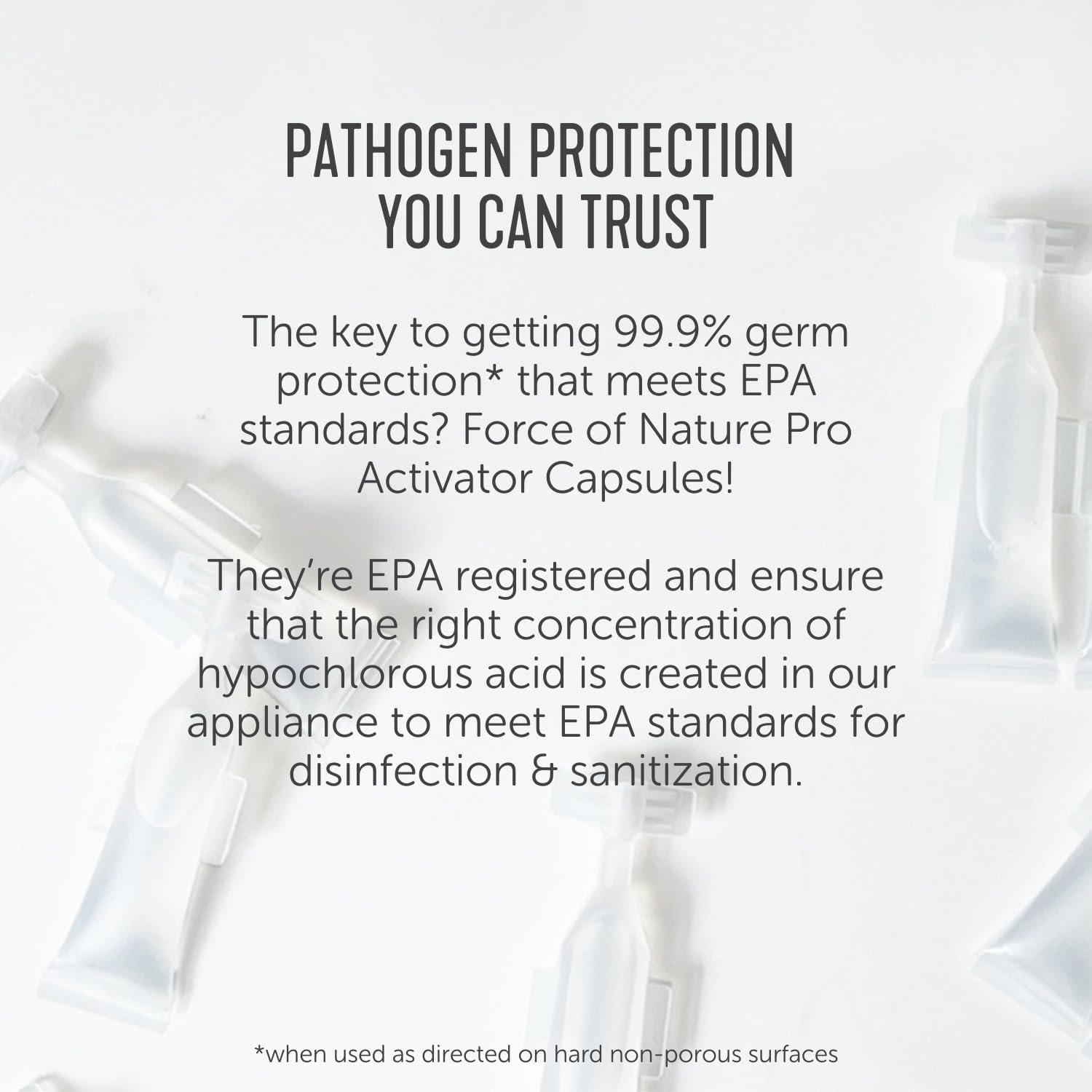 EPA REGISTERED: Each capsule contains the precise ratio of salt, water and vinegar needed to meet EPA germ-kill standards. Force of Nature Pro (sold separately) makes a hospital-grade disinfectant that’s EPA registered and kills 99.9% of germs including MRSA, Staph, Norovirus, Salmonella, Listeria, Influenza A and Pseudomonas when used as directed. (EPA Registration Number: 93040-1, CDPR License # 81952).
