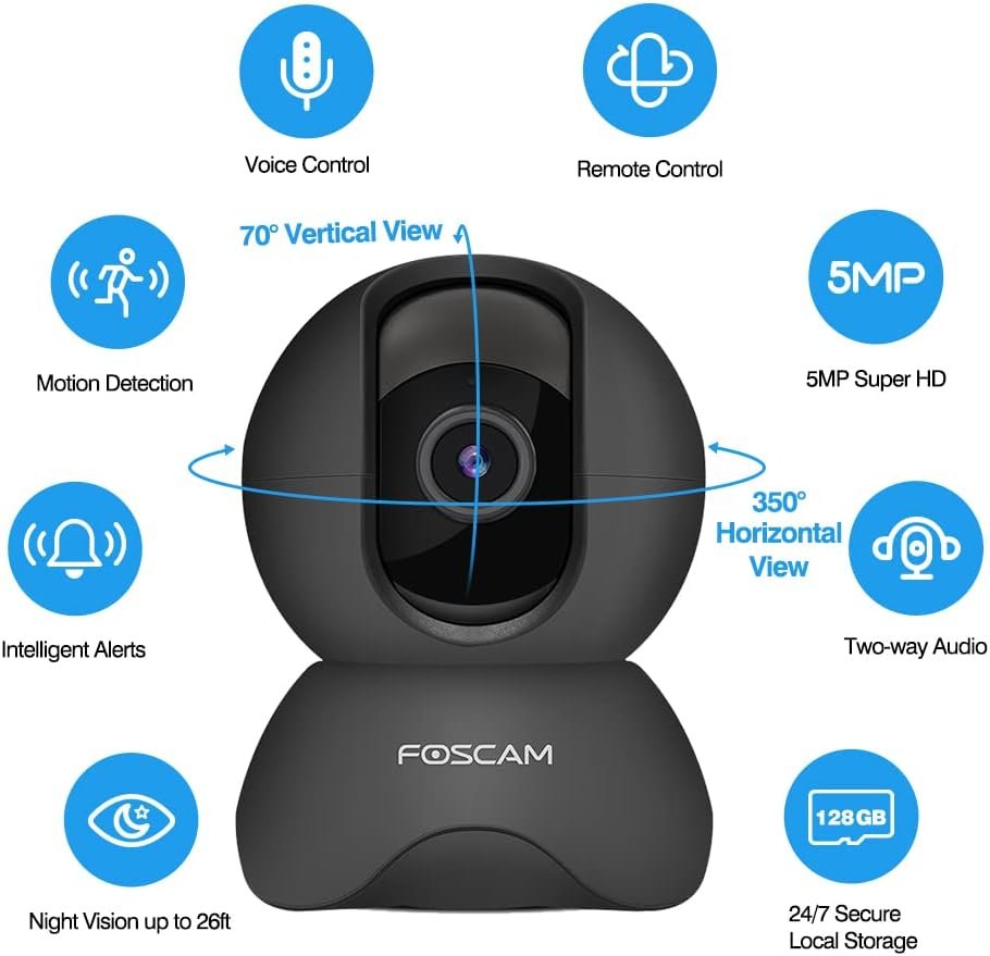 5MP Super HD Images & Superior Night Vision. Equipped with high definition color CMOS sensor,Foscam indoor security camera provides 5MP clear and crisp recordings (More clear than 1080p & 2k) .4pcs built-in advanced SMD IR-LEDs extend the range of night vision reach up to 26ft, offer you high quality crystal video even in pitch black. Ideal for wireless cameras for home security.