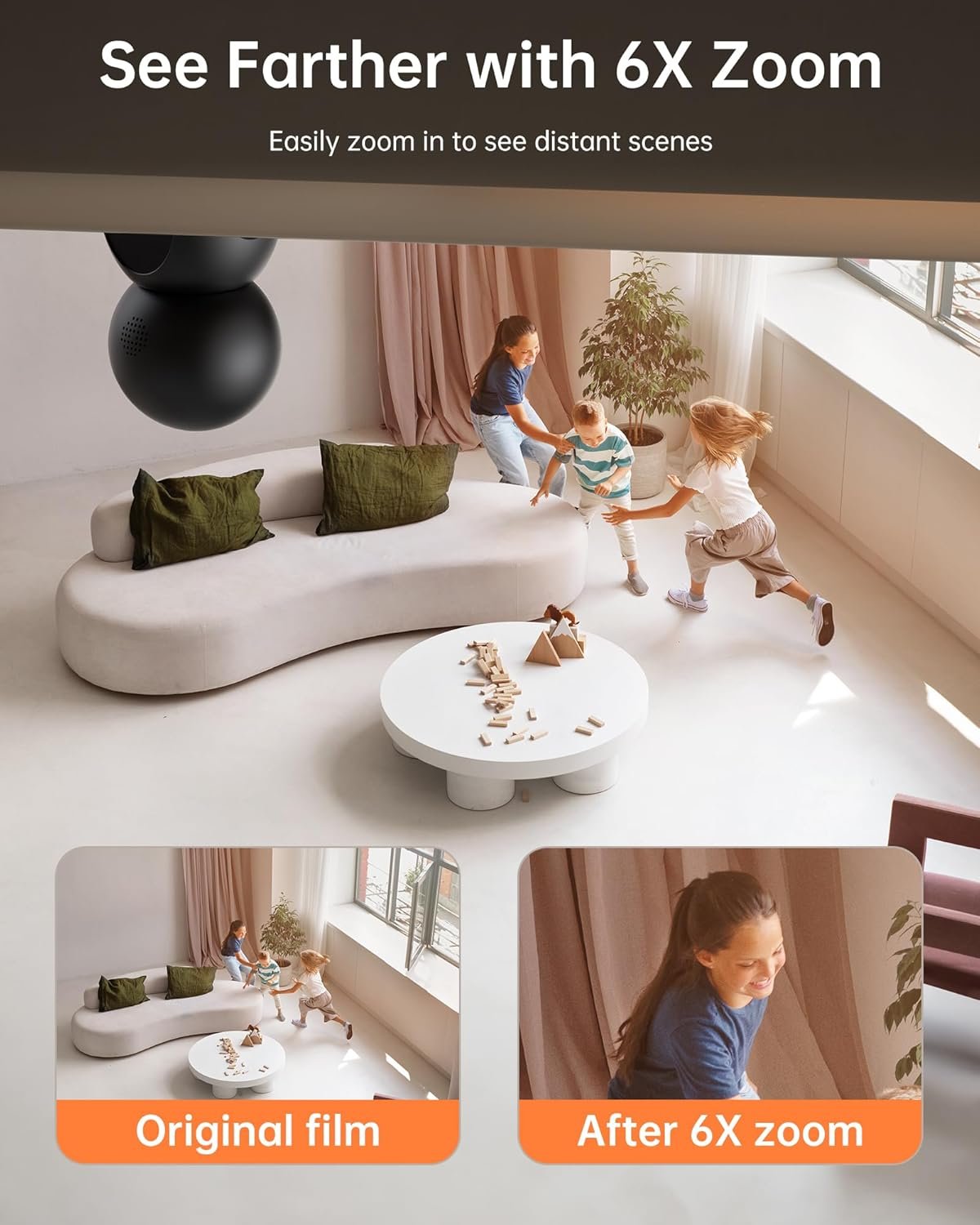 360° Camera Protection. Designed with panoramic viewing angles, Foscam WiFi camera can rotate 350° horizontally and 70° vertically, offering a 360° expansive surveillance coverage. Our pet camera built in 6X digital zoom function makes sure that you won’t miss any detail. You can monitor every corner of your home by simply panning, tilting and zooming it through the Foscam APP.