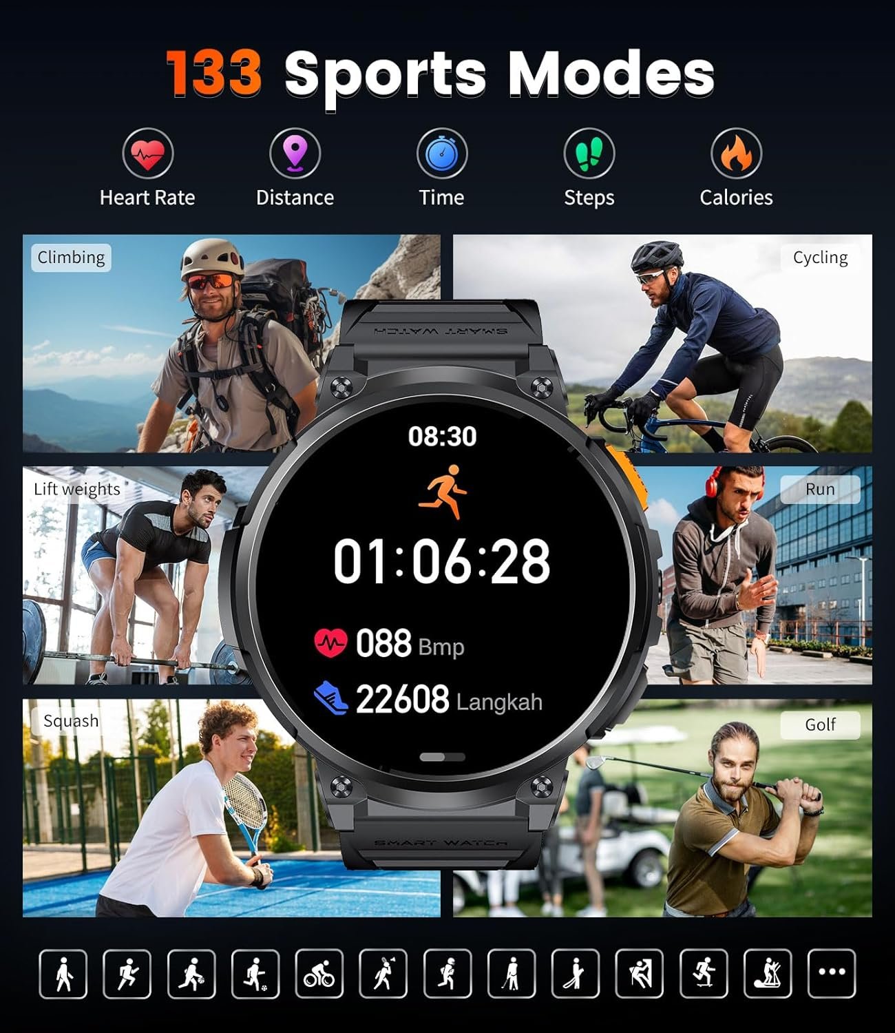 IP68 Waterproof & LED Flashlight: Whether you are exploring outdoors or doing daily work, you are fearless of wind, rain and humid environment. The smartwatch is equipped with super bright LED beads, so you can explore outdoors without fear of darkness.