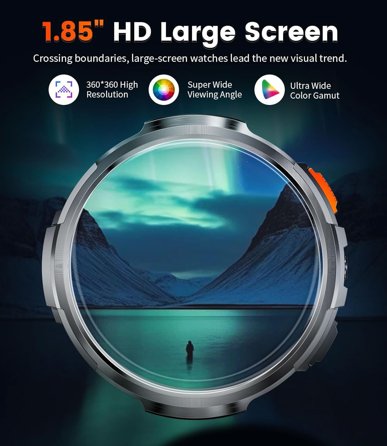 1.85-Inch Large Screen: Featuring a 1.85-inch HD IPS display, the mens smart watch offers clearer information and smoother operation. The expanded touch area makes it easy for you to view notifications and messages. The use of high-strength tempered glass ensures the screen is more resistant to damage during sports activities.