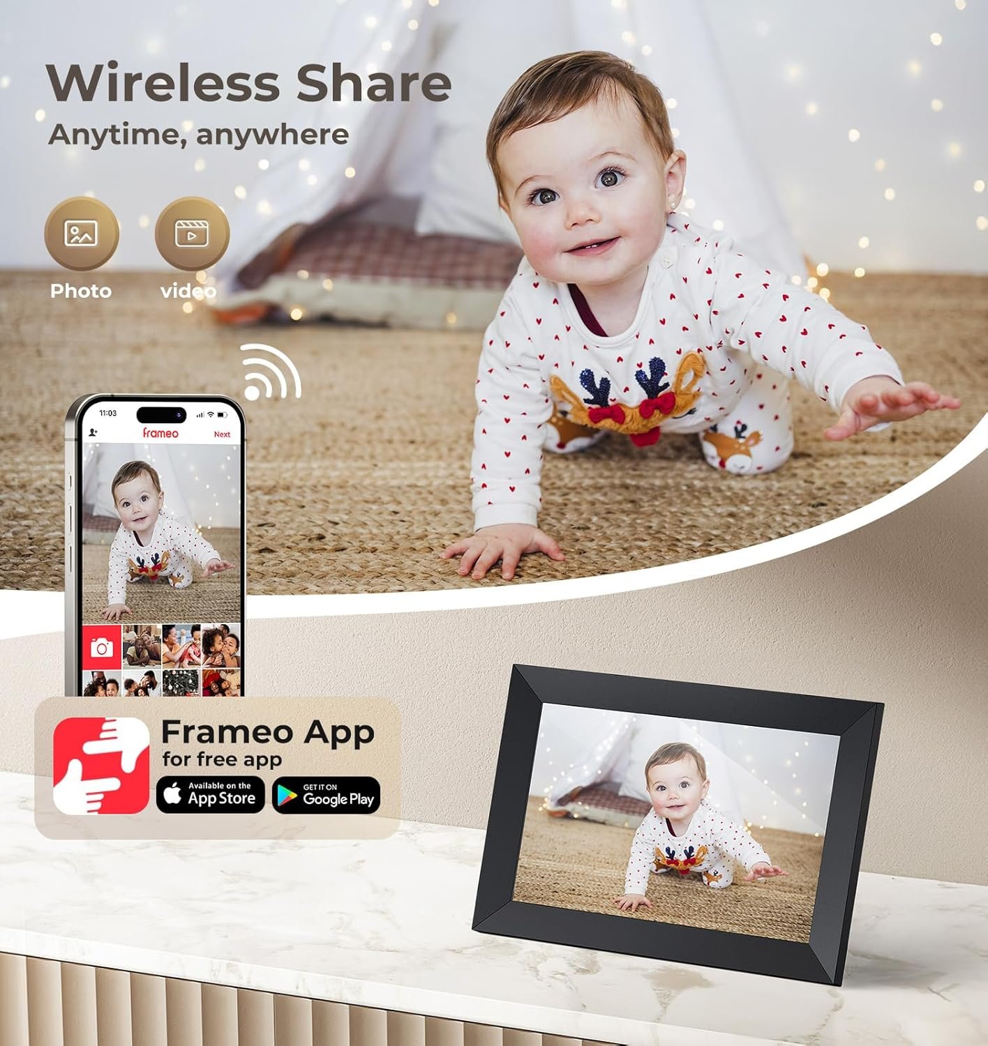【LARGE STORAGE 】This Frameo 10.1 inches WiFi digital picture frame comes with a built-in 16GB memory and supports up to 32GB Micro SD card, enabling storage of over 50,000 photos within the electronic picture frame.The free private App Frameo is available for both Android and iOS device