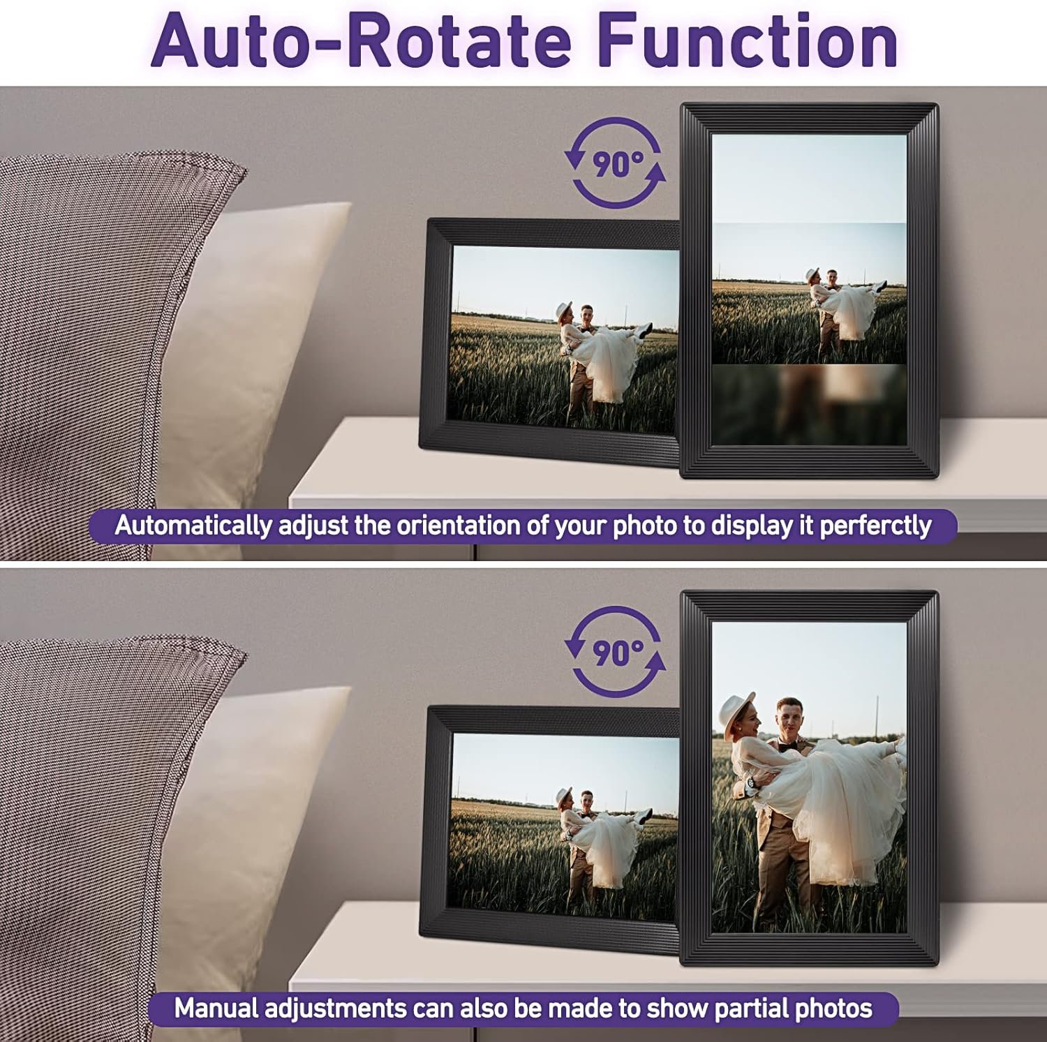 Frameo wifi digital picture frame can automatically rotate photos to adjust the direction, Come with a detachable holder as a frame stand, allowing you to view the photos in either portrait or landscape mode.