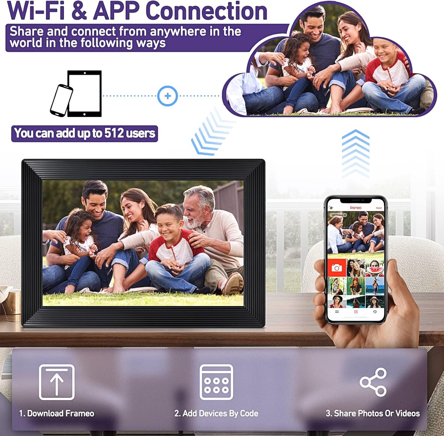 Connect the digital frame to WiFi, then download the free Frameo App on your phone, easily send photos or a video to the frame. And also your families and friends can privately and safely share wonderful moments with you from anywhere and anytim