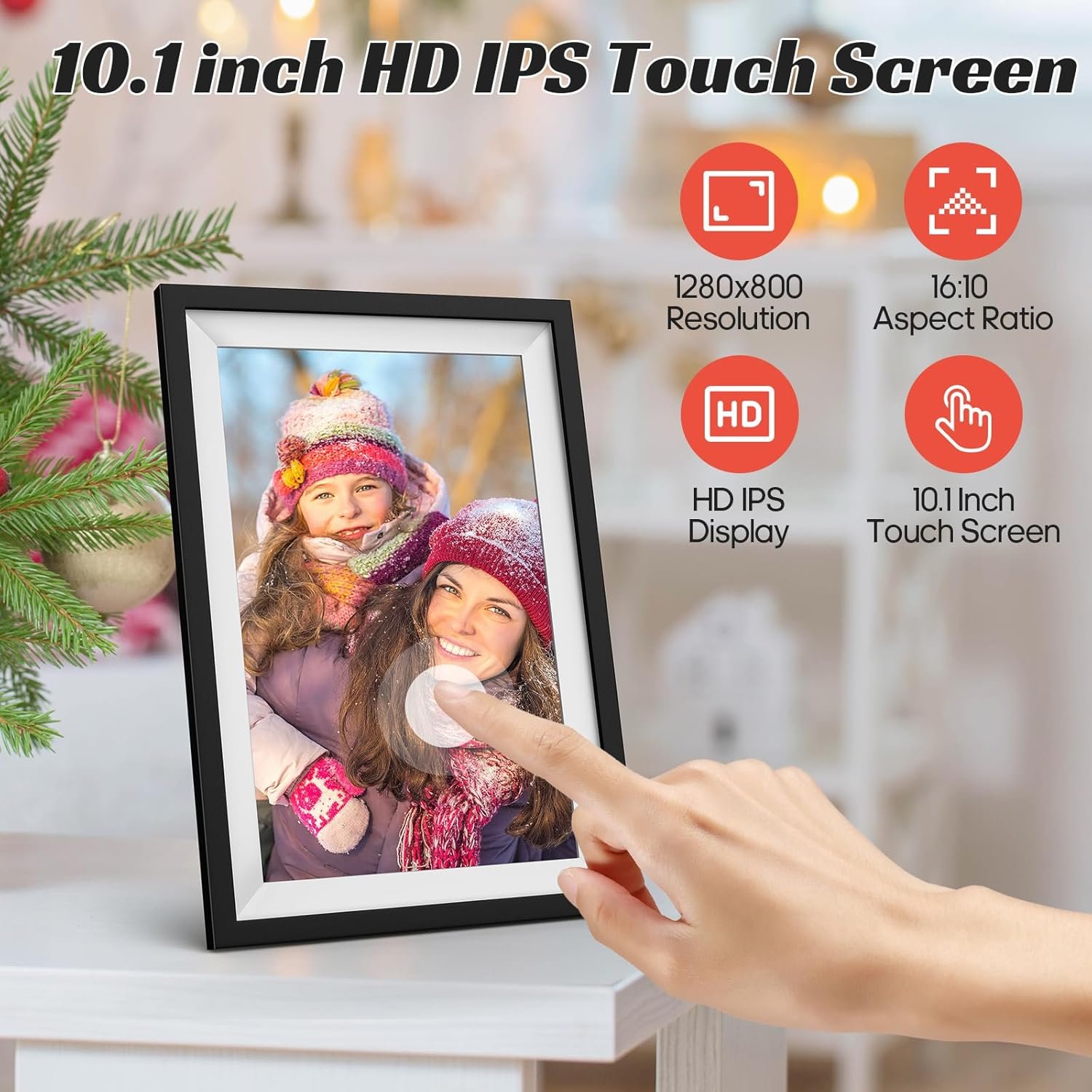 10.1 Inch IPS Touch Screen: The 10.1″ WiFi digital picture frame is featured with a high-quality HD 1280*800 resolution IPS touch screen. and the viewing angle of the panel can reach 178°, allowing you to obtain good visual effects from any angle. Stunning color fidelity will 100% pass the vividness and cuteness of you