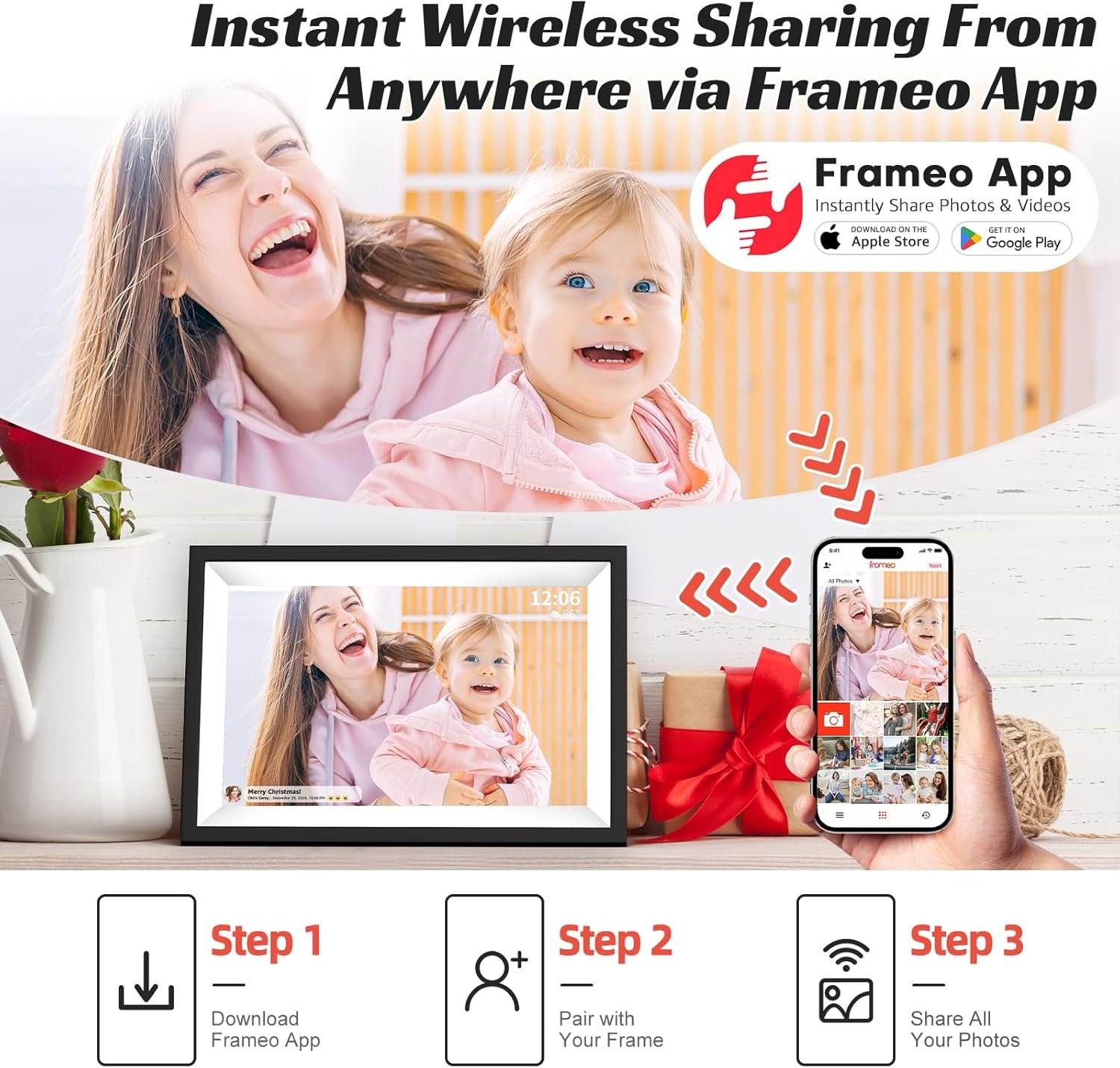Instant Wireless Sharing: Connect your digital picture frame to WiFi and instantly share photos via Frameo from anywhere, at any time. With 32GB built-in memory and supporting for external storage, it can store 50,000+ photos. Frameo offers you complete control, privacy, and security