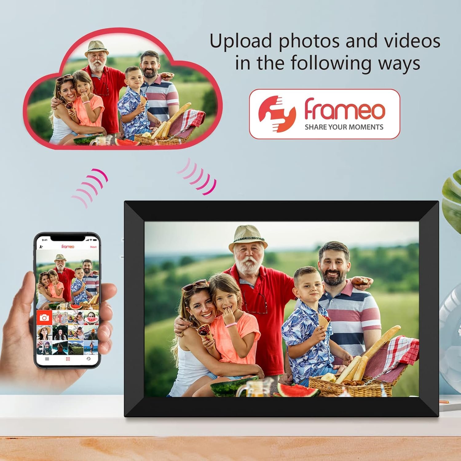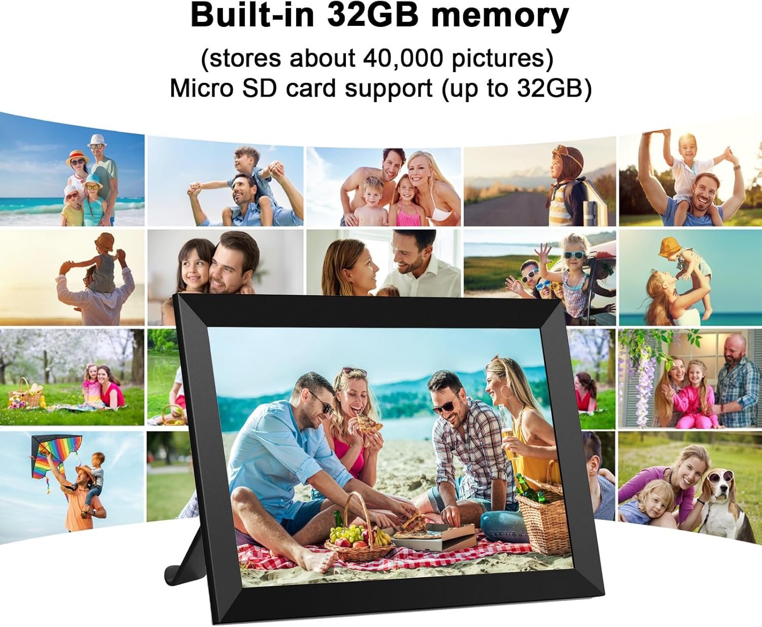 đ ăEffortlessly Share Photos & VideosăInstall âFrameoâ App on your phone (iOS/Android), connect the wifi digital picture frame to Wi-Fi, and enter the code to quickly start updating photos and videos, from anywhere in the world. With 32GB internal memory, this digital photo frame can store approximately 40,000 pictures. Expand storage up to 32GB with a Micro SD Card (not included). The App uses the Secure Device Grid for private, secure sharing.