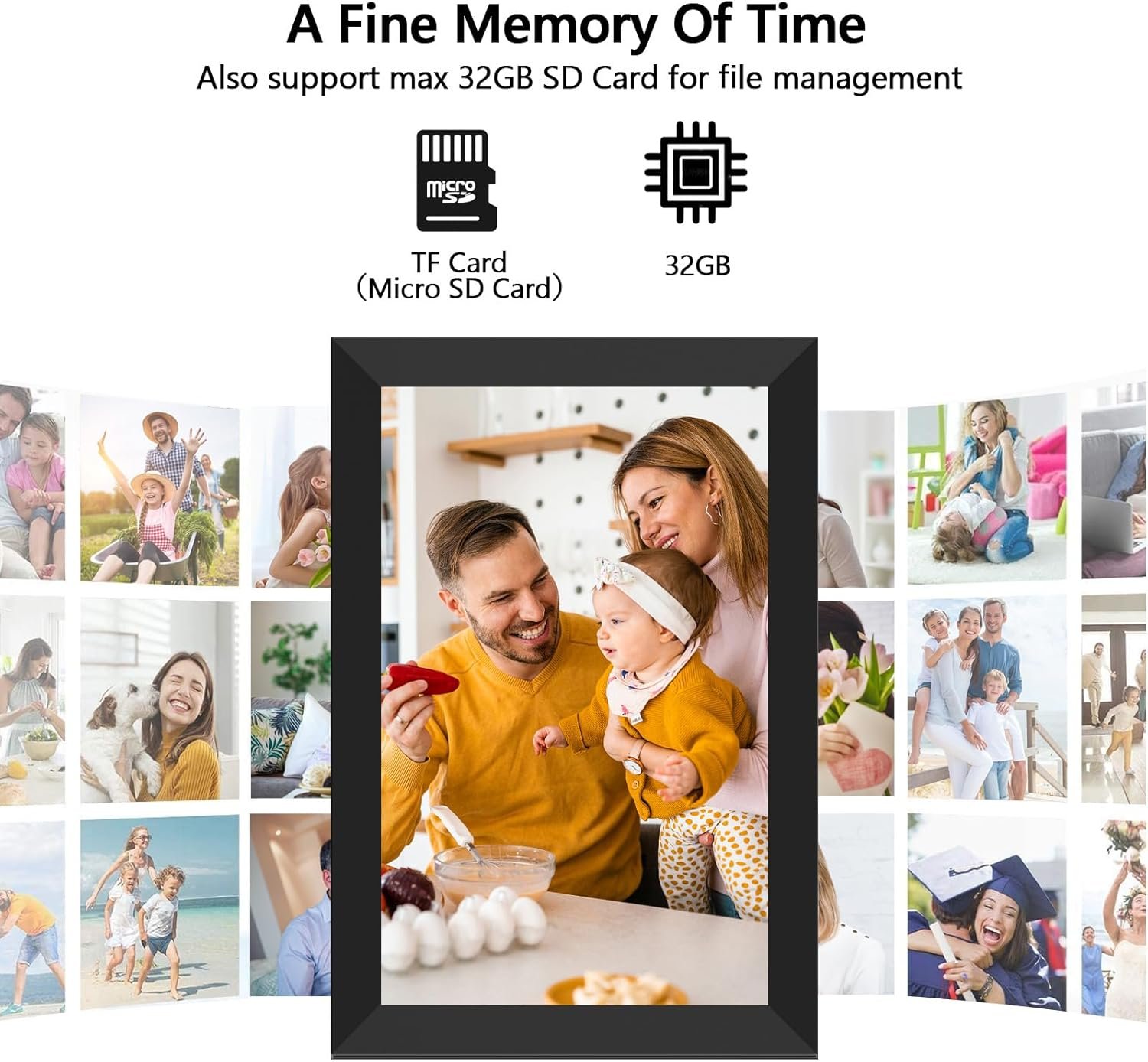 AUTO-ROTATE & LARGE INTERNAL STORAGE: YENOCK picture frame can automatically rotate photos to adjust the direction, which allows you to place the WiFi photo frame in either portrait or landscape mode or on the wall. Built-in 32GB Memory empowers a huge capability of storage (around 80,000 photos of 300KB/pc). Also support max 128GB micro SD card for file management.