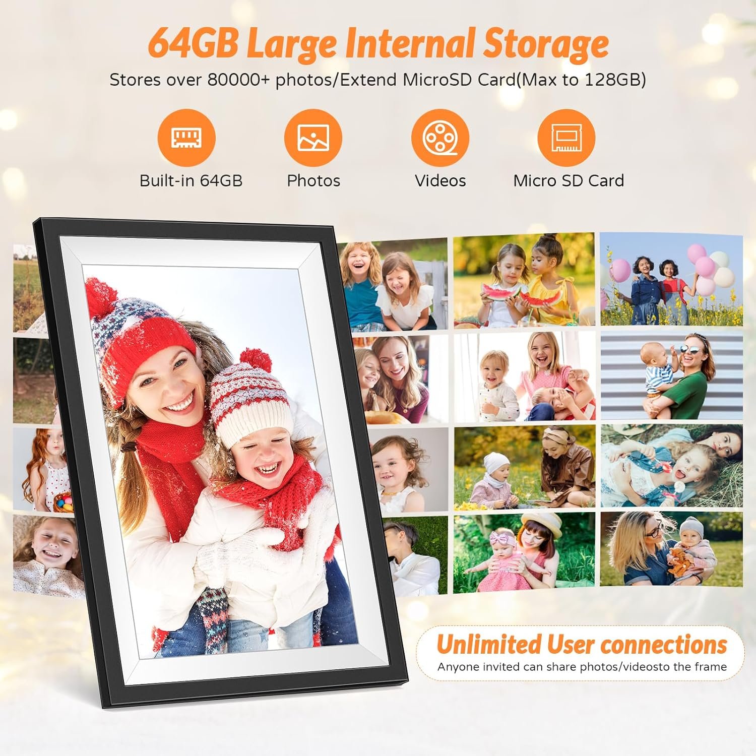 Large Storage Capacity: The XISKT digital picture frame boasts a generous 64GB of built-in memory, allowing you to store over 80,000 photos—far exceeding the typical 32GB and 16GB digital frames available on the market. Plus,this electronic picture frame supports microSD card expansion up to 128GB, ensuring you never run out of space for your cherished memories.Enjoy peace of mind with digital photo frame, where every moment can be saved.