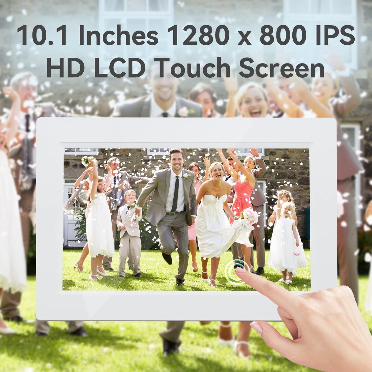 The wifi digital picture frame is 10.1 Inch in size with 1280X800 IPS HD LCD display and touch screen operation. Very easy to use, even the elderly can easily know how to operate it.