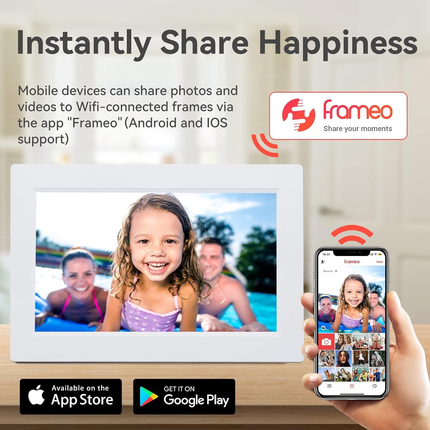 ❤️ Wi-Fi & APP CONNECTION: Connect the Frameo digital photo frame to Wi-Fi and sharing the wonderful moments through the free “Frameo” APP which available for both Android and iOS. You can send photos or small videos to the photo frame direct anytime anywhere, no need creating email account or no need Facebook.