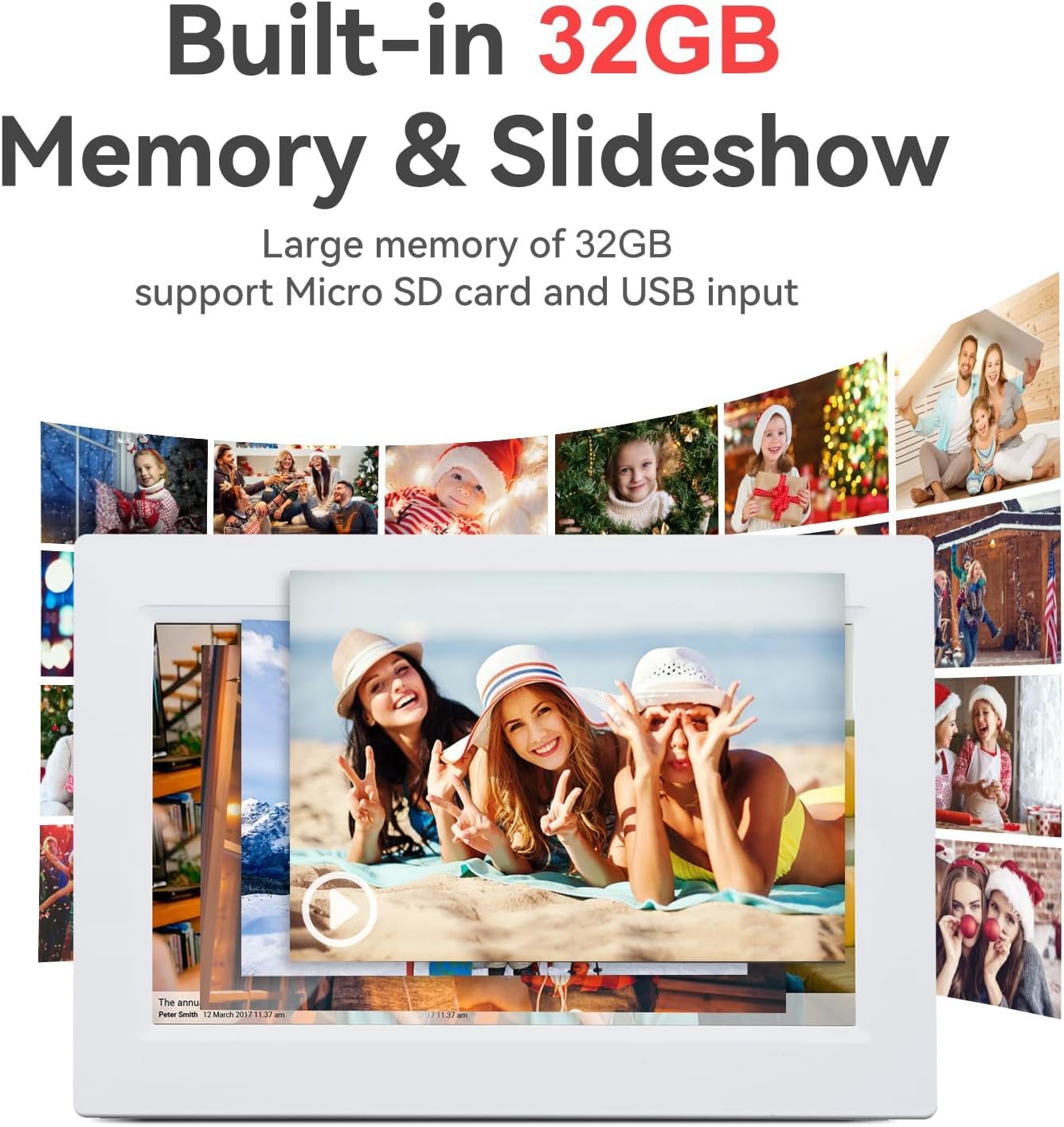 The frameo wifi photo frame is built-in 32GB large internal memory that can store up to 80,000 pictures(300KB/pc). In addition, the digital photo frame supports micro SD card for memory expansion and USB cable input
