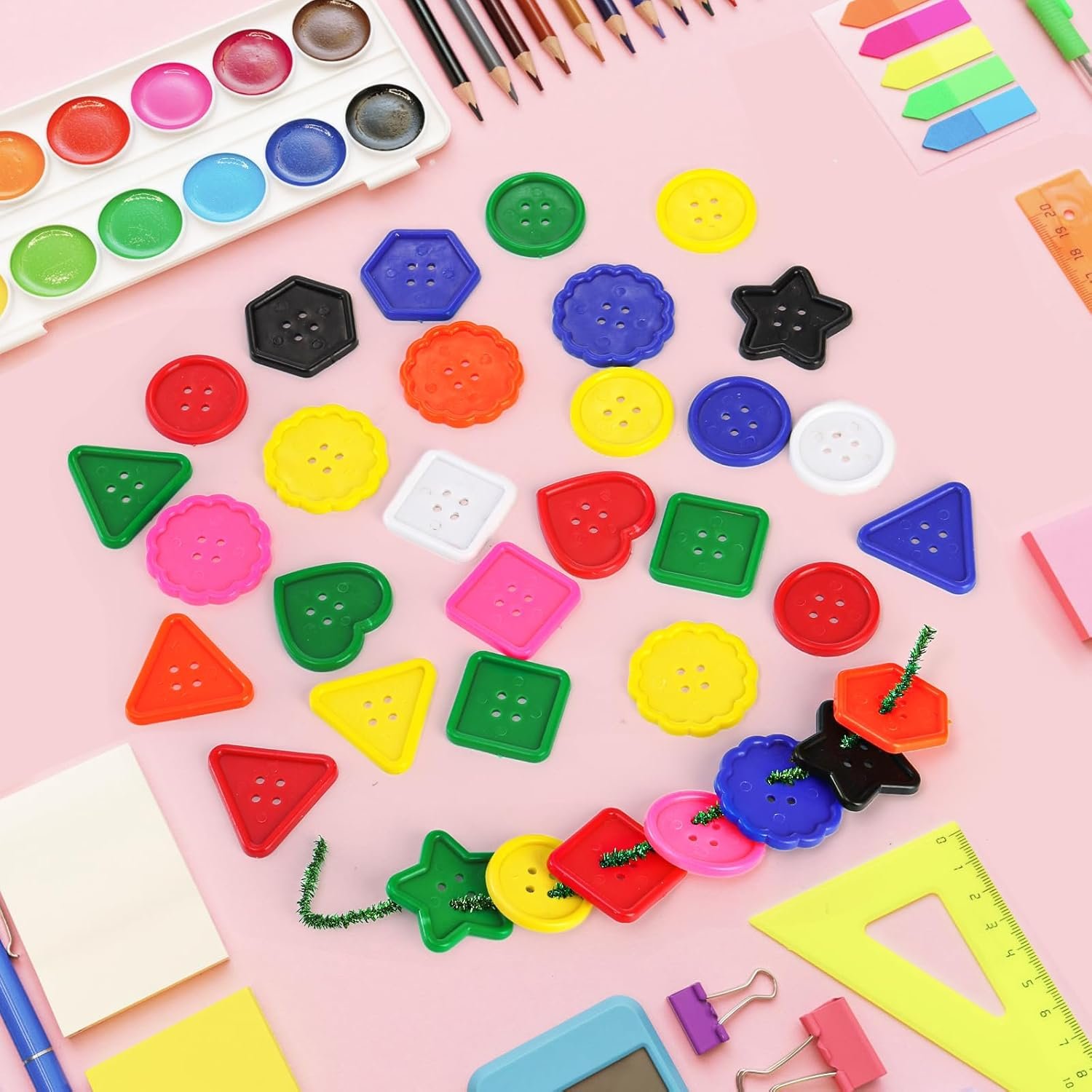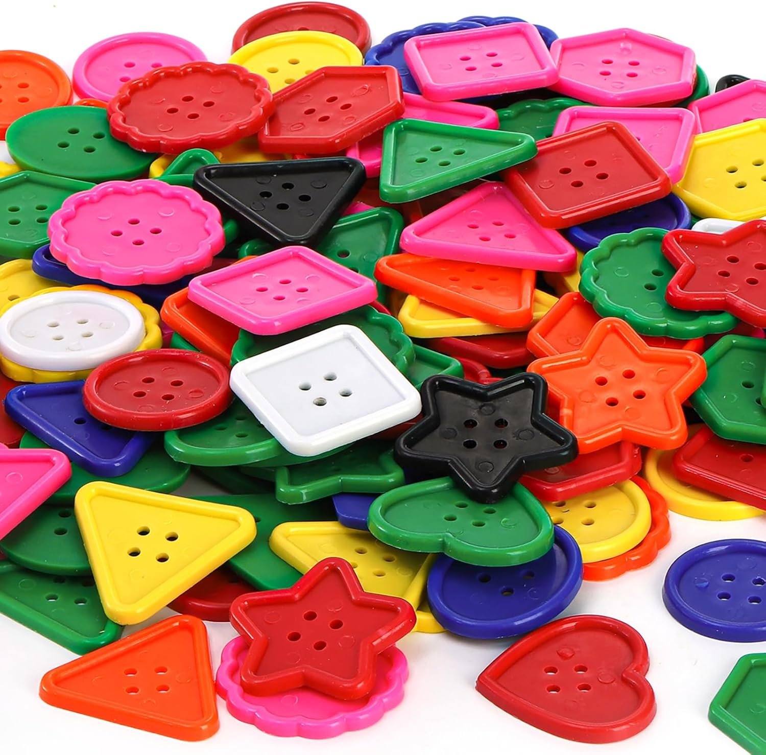 150 Buttons in Bulk: You will receive 150 pcs big bright buttons in 8 random shapes and colors: shapes including flower, star, heart, square, round, oval, triangle and hexagonal. Colors including red, blue, white, yellow, black, pink, green and orange. The different shapes have different sizes, the diameter are measure about 1.5-2 inches