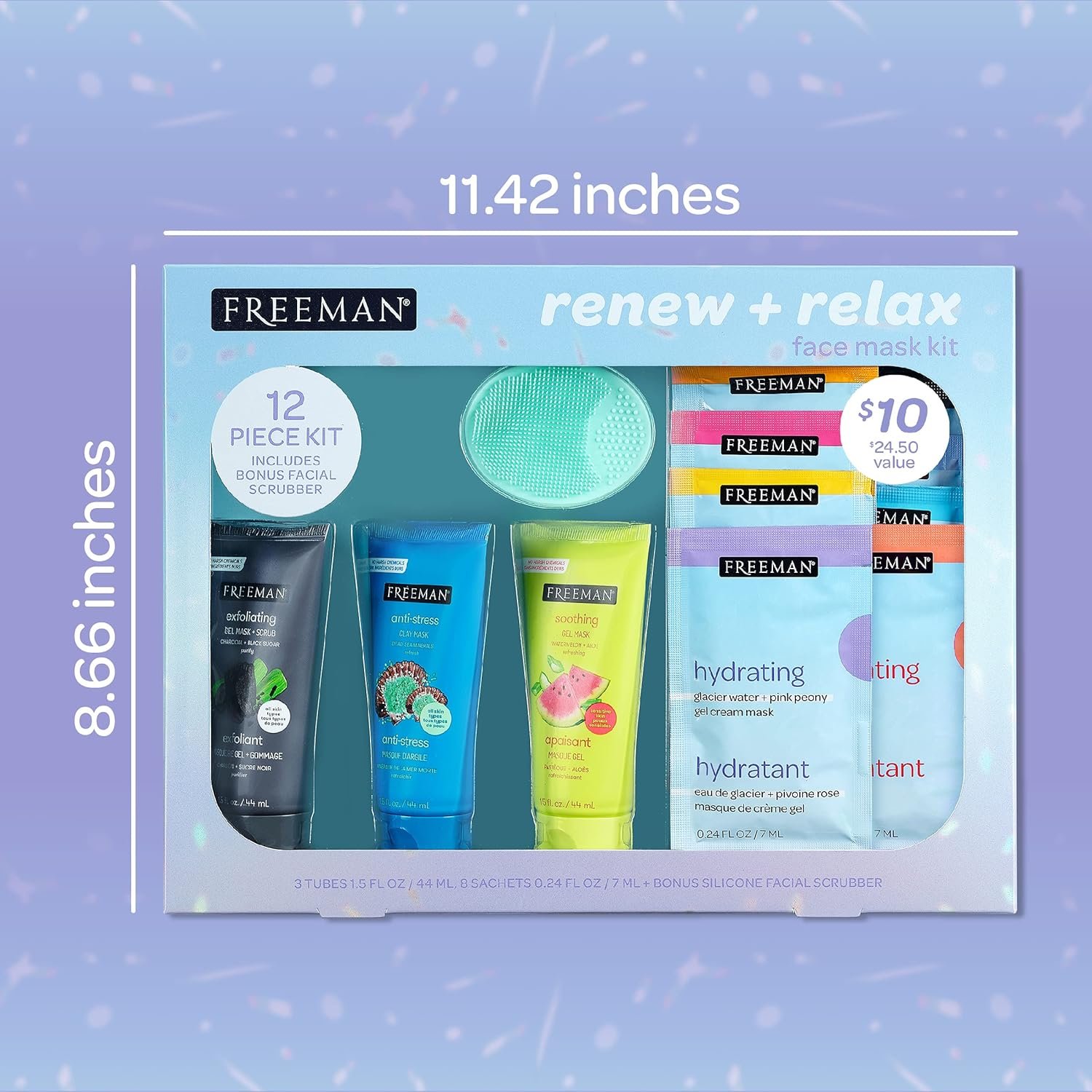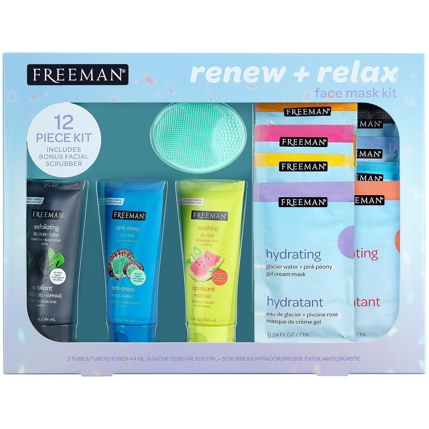 Freeman Limited Edition Renew & Relax Mask Kit, Face Masks To Soothe, Rejuvenate, and Deep Cleanse Pores, Facial Mask Variety, Silicone Mask Applicator, Cruelty Free Skincare, 12 Piece Gift Set