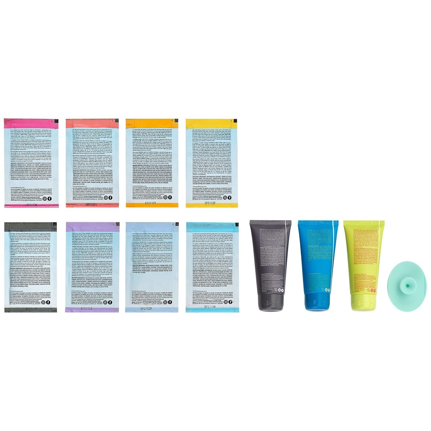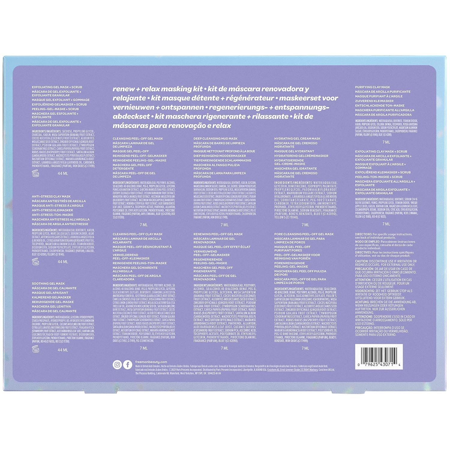 Freeman Renew & Relax Mask Kit 12 Piece Kit includes: (8) 0.24 fl. oz. mask sachets, (3) 1.5 fl. oz. mask tubes, and a bonus silicon scrubber