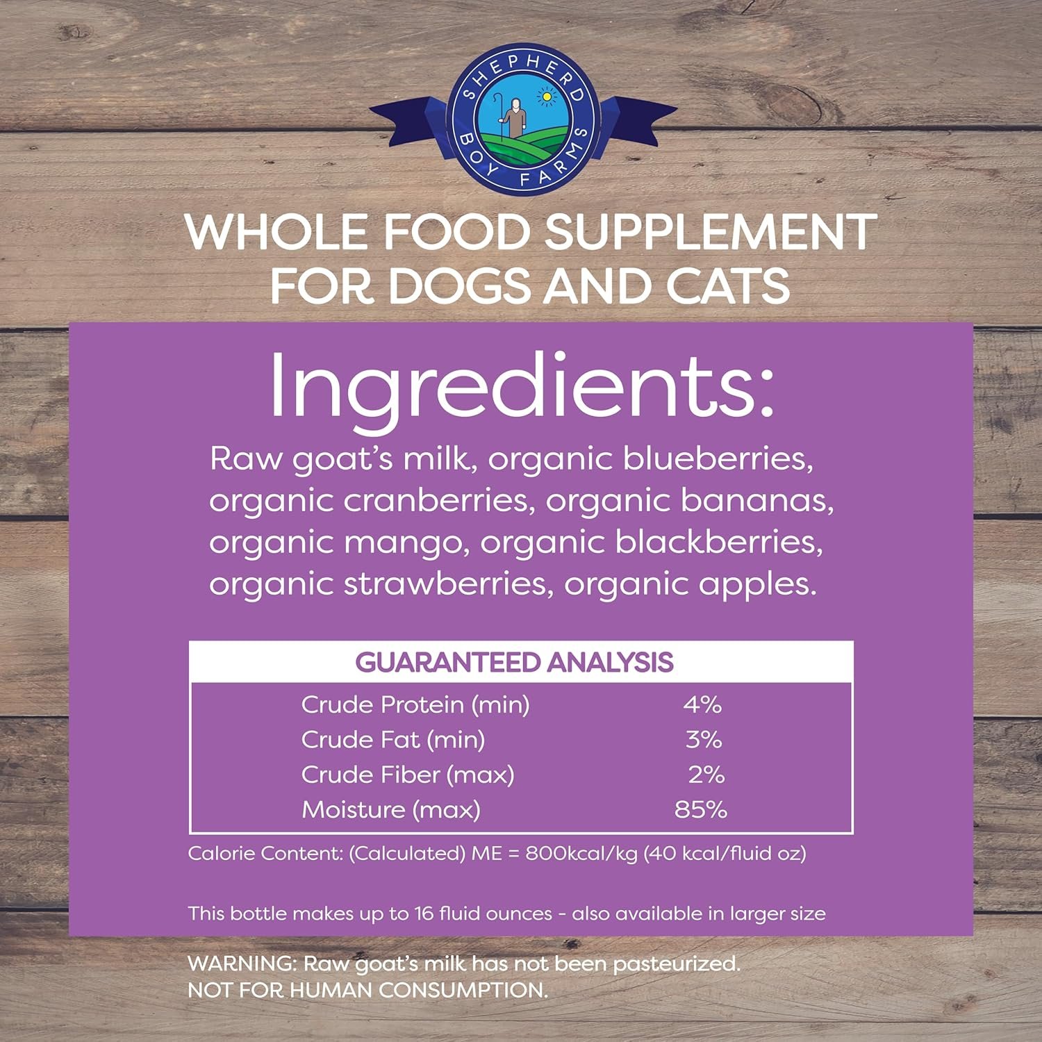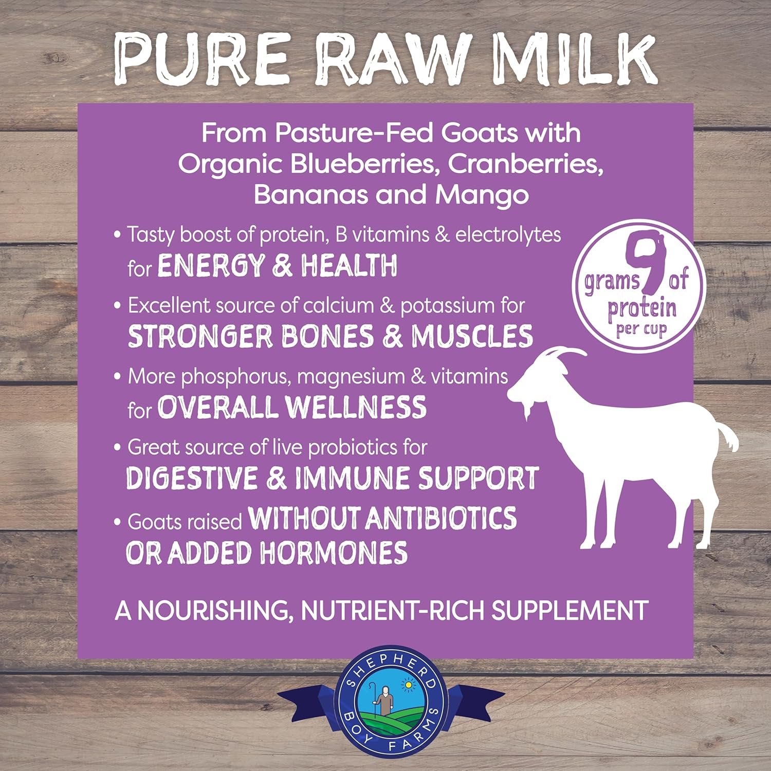 NUTRITIONAL SUPPLEMENT WITH ORGANIC WHOLE FRUITS AND VEGETABLES. Combines real organic USA fruits and vegetables with highly digestible goat’s milk. Contains high amounts of protein, calcium, vitamin B6 & B12, vitamin A, and electrolytes for stronger bones, muscles, and energy
