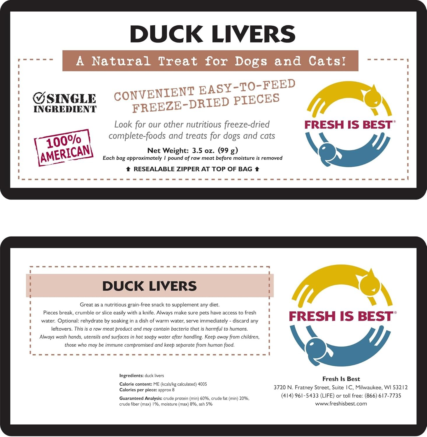 Duck Livers – This 3.5 oz bag contains only fresh freeze dried high quality duck livers. All natural raw meat, no added hormones, preservatives, or fillers. 100% grain, gluten and starch free, human quality ingredients.
