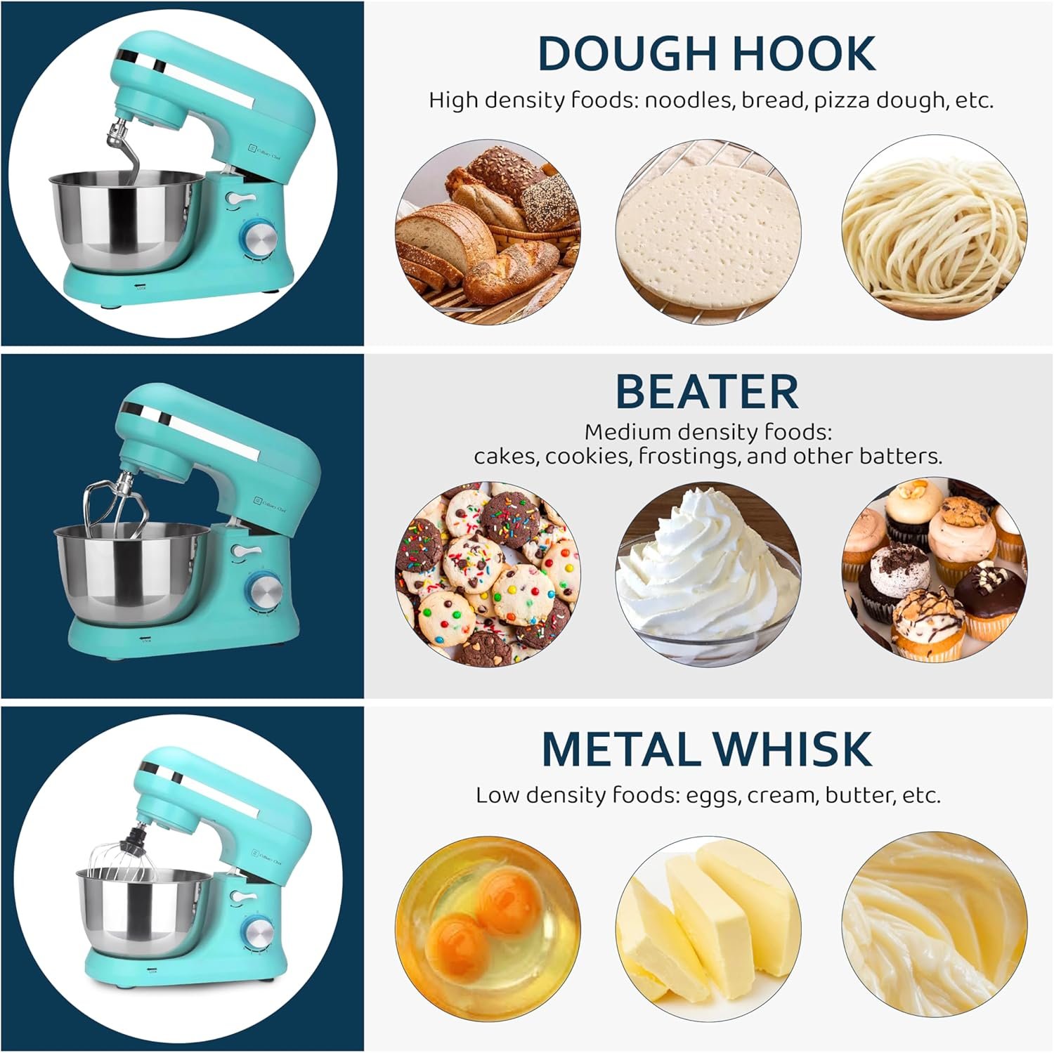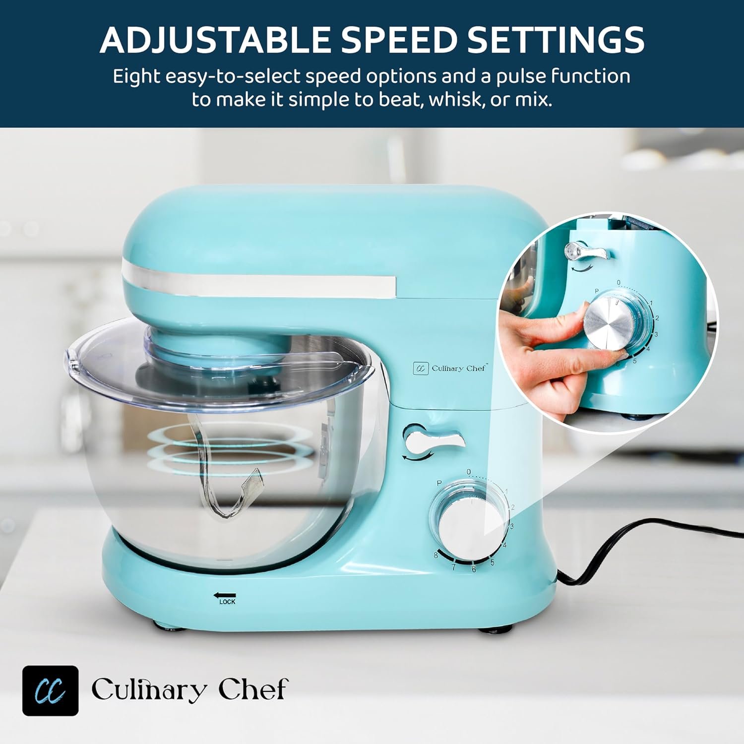 8 speeds & mixing guide; go from a slow stir to a fast mix, with exact control at each one; a helpful guide at the mixer’s top lets you know which speed to use for various mixing methods