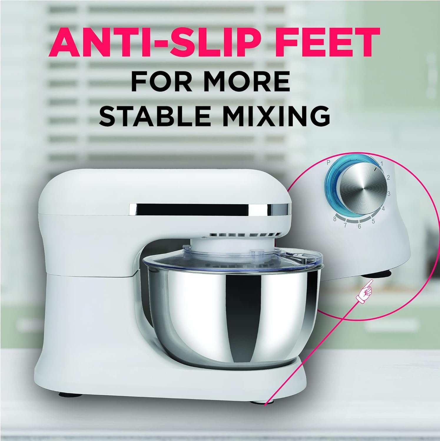 33° adjustable arm lift, 4.5L brushed stainless steel 304 bowl, Pure copper AC motor, Low noise (75Db at highest speed)