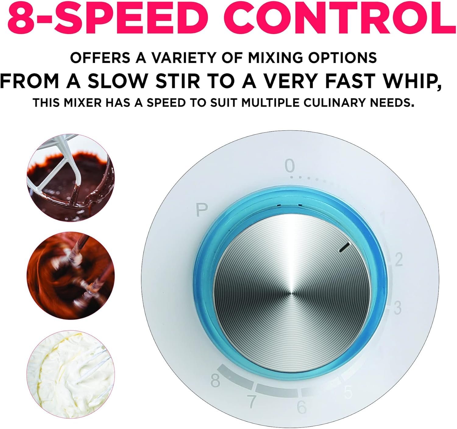 8 speeds & mixing guide; go from a slow stir to a fast mix, with exact control at each one; a helpful guide at the mixer’s top lets you know which speed to use for various mixing methods
