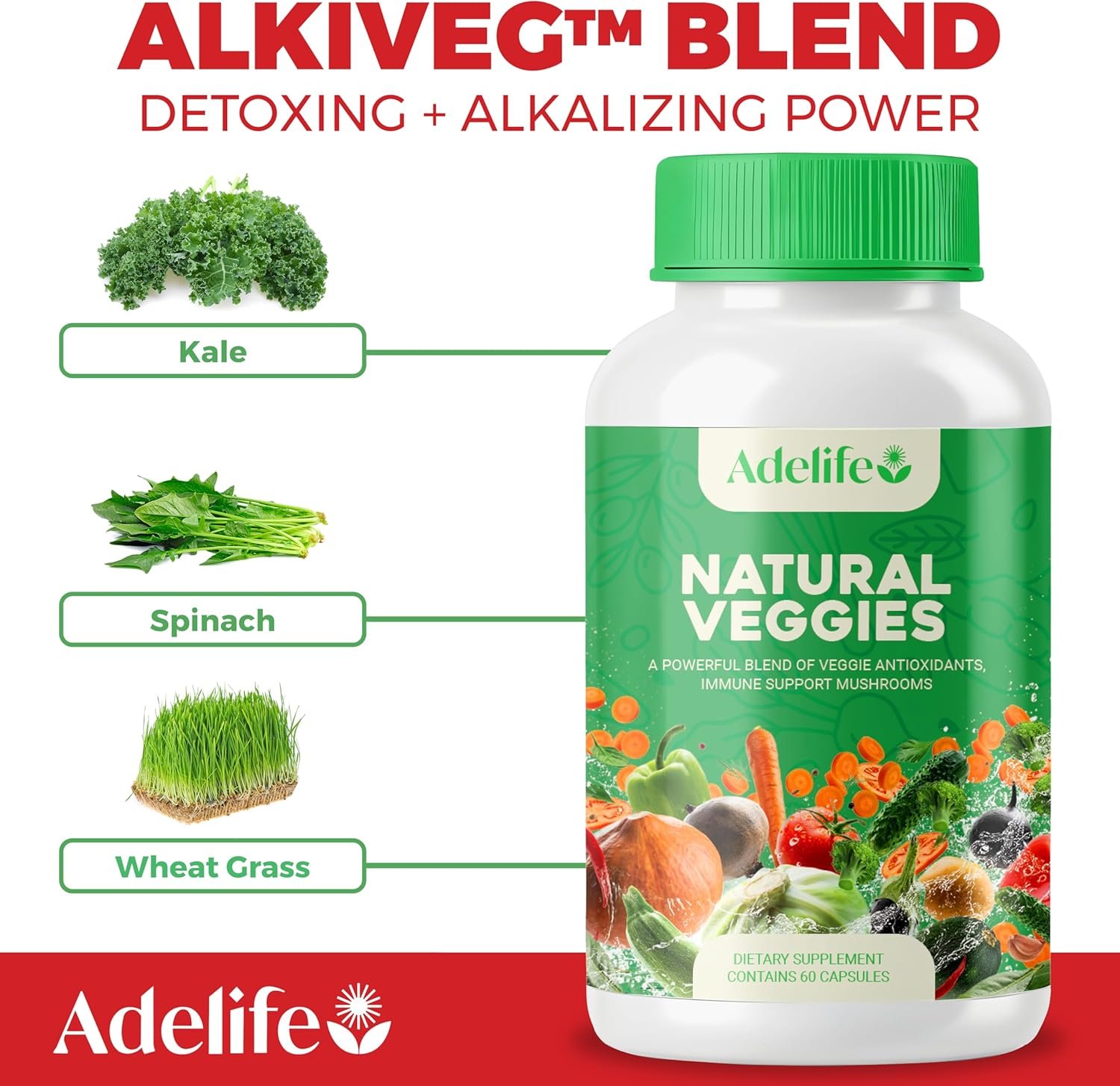 Alkiveg: Broccoli Sprout and Kale maintain a balanced pH and support detoxification. Reishi and Maitake mushrooms boost immune defense and regulate immune response for balanced health. Aloe Vera, Garlic, and Spirulina support digestion, detoxification, and skin health.