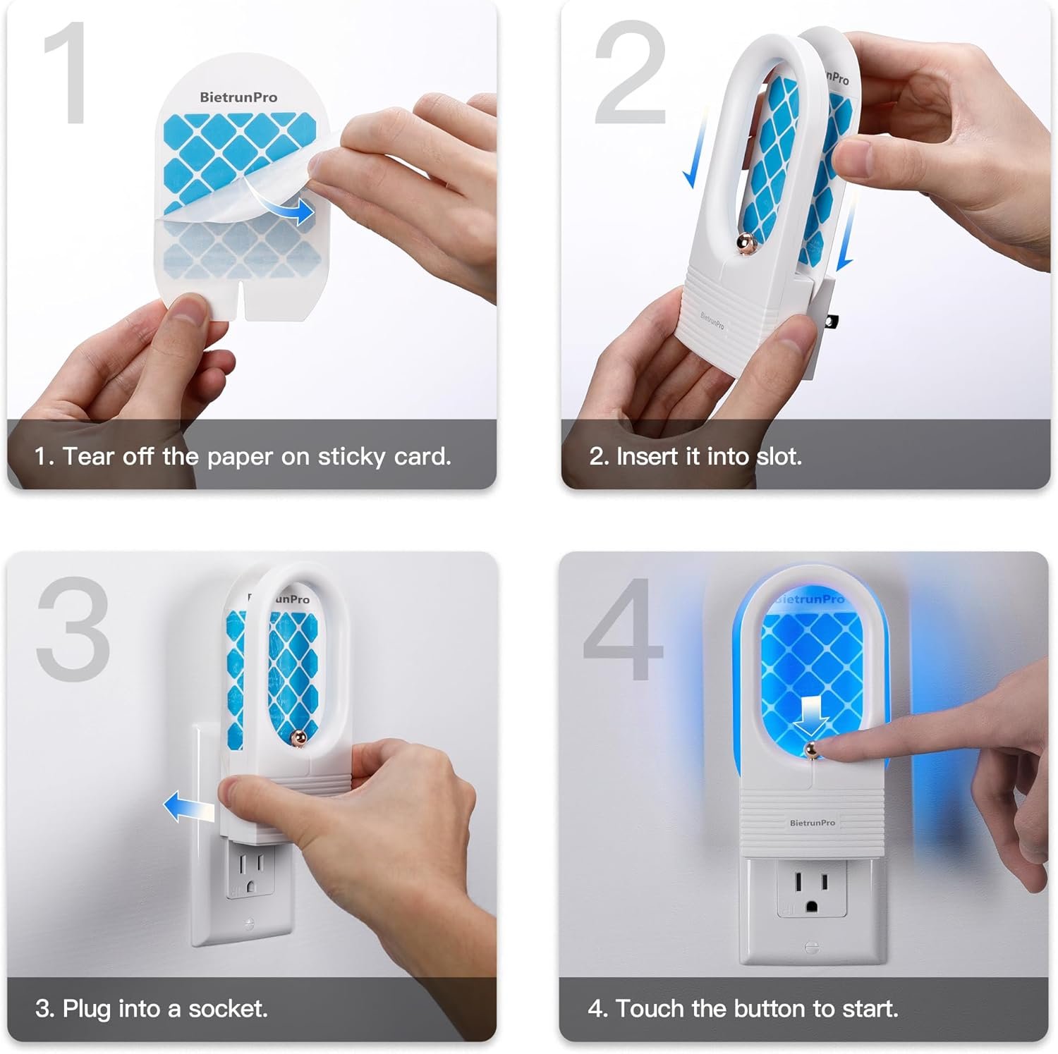 Plug-and-play: ●Just remove the protective film from the adhesive board, insert it into the device, and plug it into a socket. Activation is as easy as a touch. ●We recommend that in the closed room, no one and the lights are not turned on to use this Fruit Fly Traps to capture more pests and achieve the best effect. Effectively prevent being bitten.