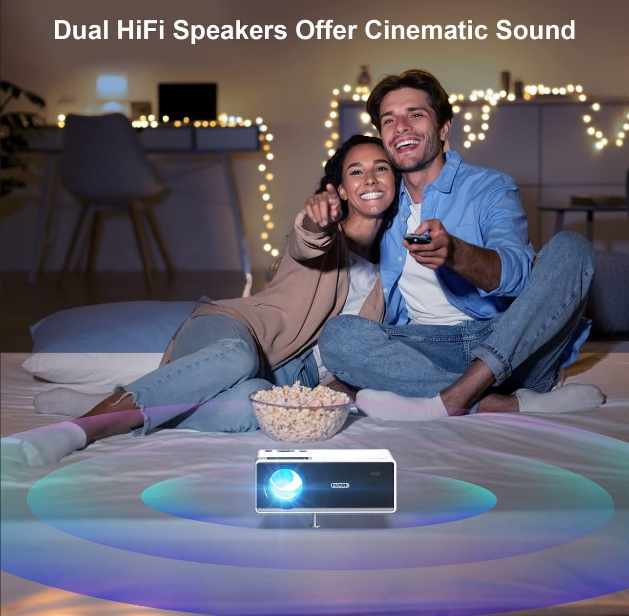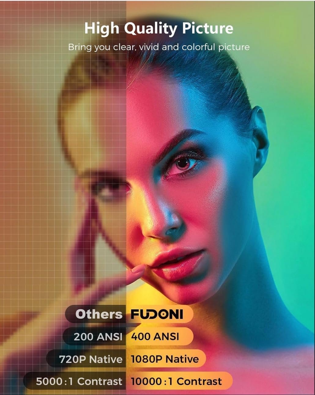 【HIGH-QUALITY SOUND PROJECTOR】Built-in dual HiFi speakers for great stereo surround, this home theater projector with speaker is the best choice for indoor and outdoor use. More important, the FUDONI Bluetooth projector with 5.1 Bluetooth allows you to easily connect your ideal soundbar, headphone, or other audio equipment.