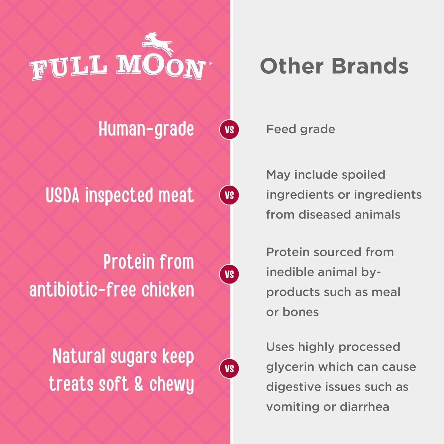 U.S.-GROWN CHICKEN: Full Moon treats are proudly made in the United States using regionally sourced ingredients, including USDA approved, antibiotic-free chicken.